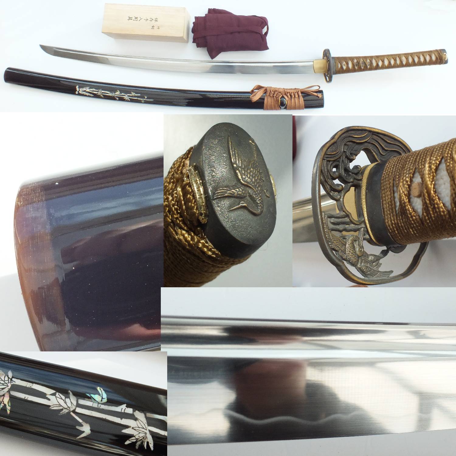 Measuring 41″ overall with a 28.5″ sharpened, hand-forged, differentially clay-tempered, 1060 high carbon steel blade, this sword boasts a high polish finish. It features a full tang, double pegged for security. The handle is wrapped in Japanese silk ito with genuine rayskin underneath, complemented by a top-quality, hand-finished copper tsuba. Mother of Pearl is meticulously inlaid into the saya, enhancing its elegance. This exquisite piece of history comes complete with a lined cotton sword bag and maintenance kit, presenting a stunning aspect from its fittings to its finish.
