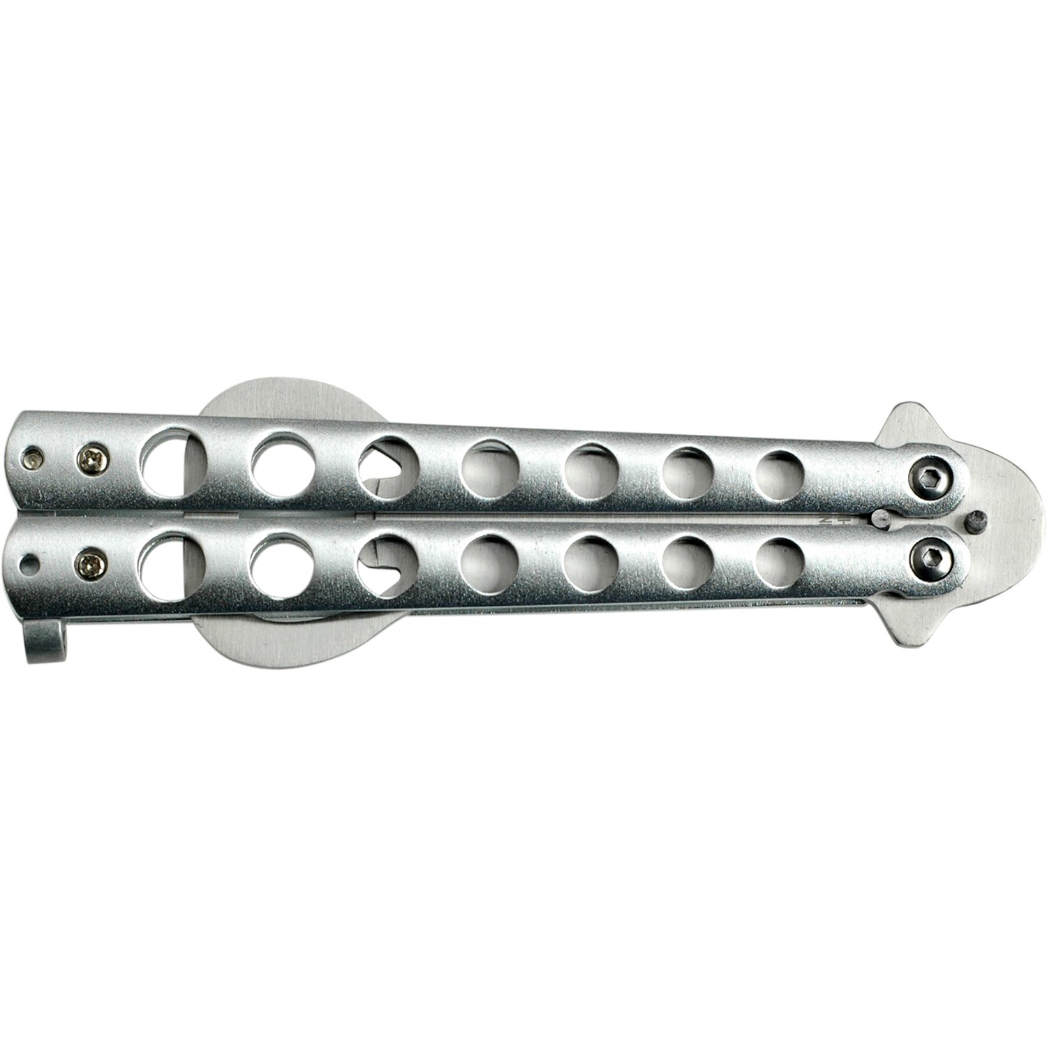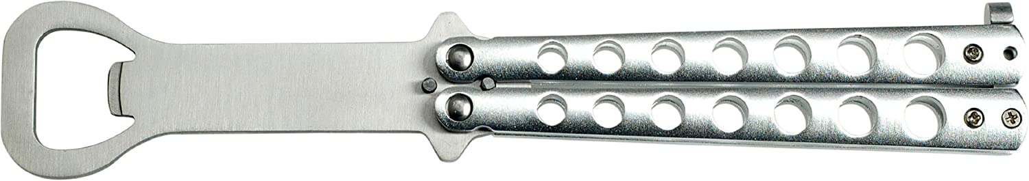 Here we have a silver handle trainer practice balisong butterfly knife silver bottle opener dull. Practice tool used to practice flipping and tricks. The butterfly bottle opener is constructed from stainless steel with a locking catch. It measures 5.25″ closed and 8.25″ open. Practice your flipping with a dull, safe, balisong trainer which also has a practical use as a bottle opener.
