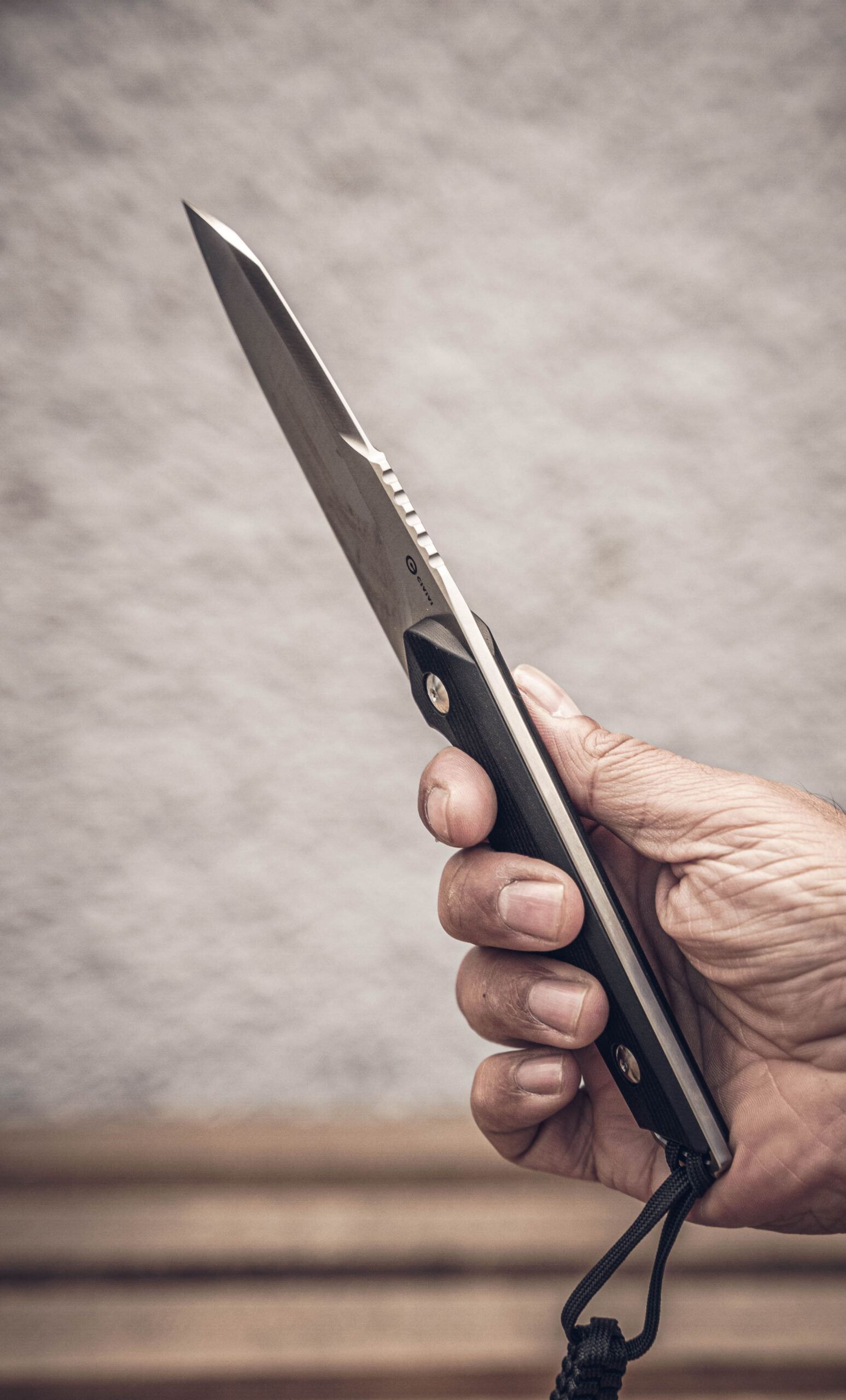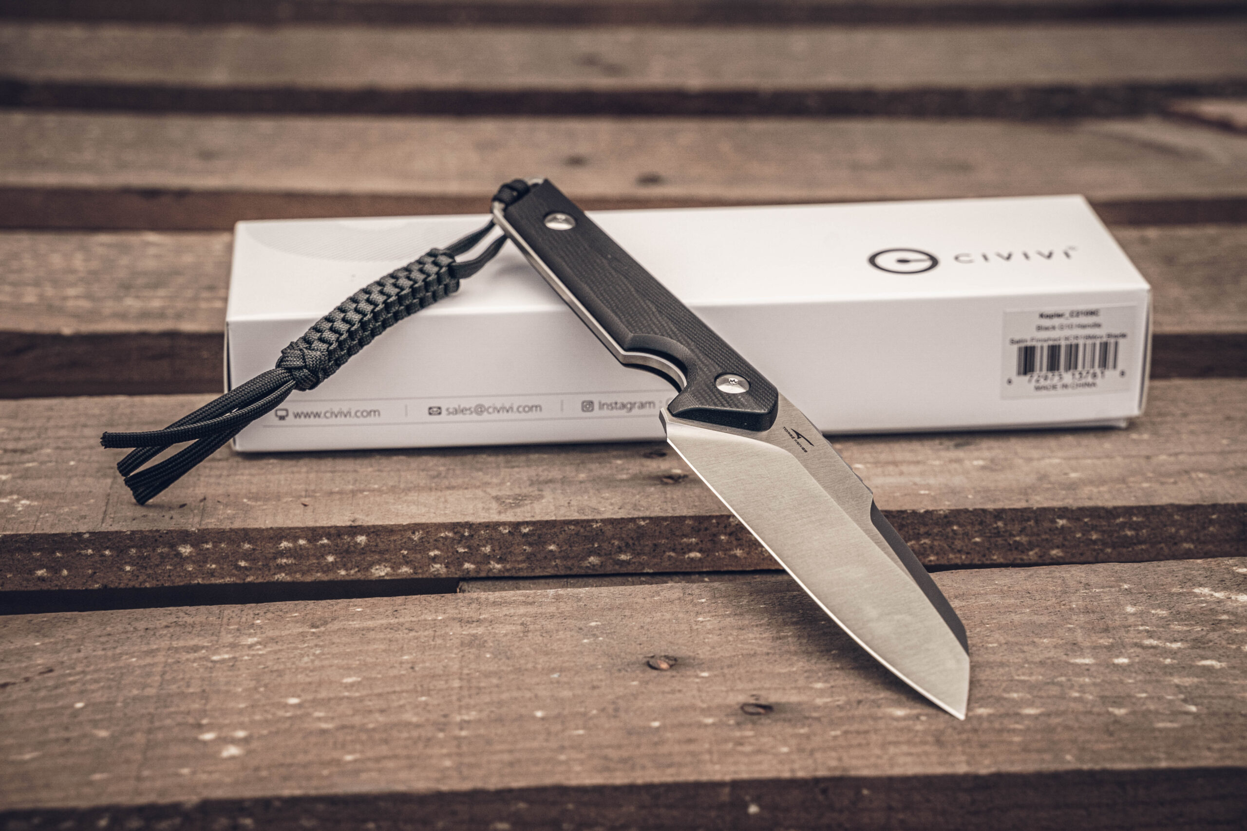 The CIVIVI Kepler is a big and bad fixed blade with a compound grind and a Wharncliffe blade. The handle is made of G-10 with a deep finger choil, so the knife will never twist in your hand, no matter how hard you use it.