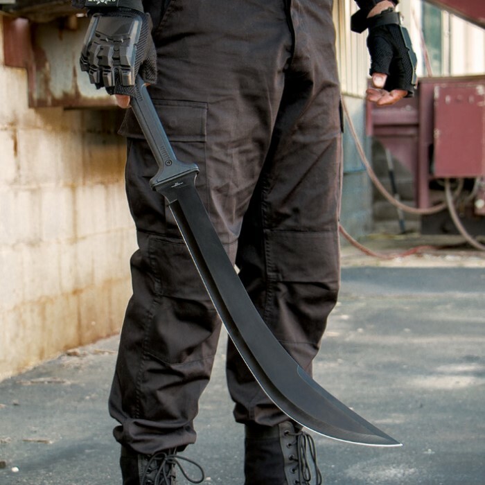 You will be absolutely amazed with the Combat Commander Thai Nagi Sword in your hands. The 20″ sharp blade is of 1065 carbon steel and has a black hard coating finish. The handle is of nylon fiber and is as tough as they get! A nylon sheath with a shoulder harness lets you carry it with ease. It is 40 1/2″ inches overall.