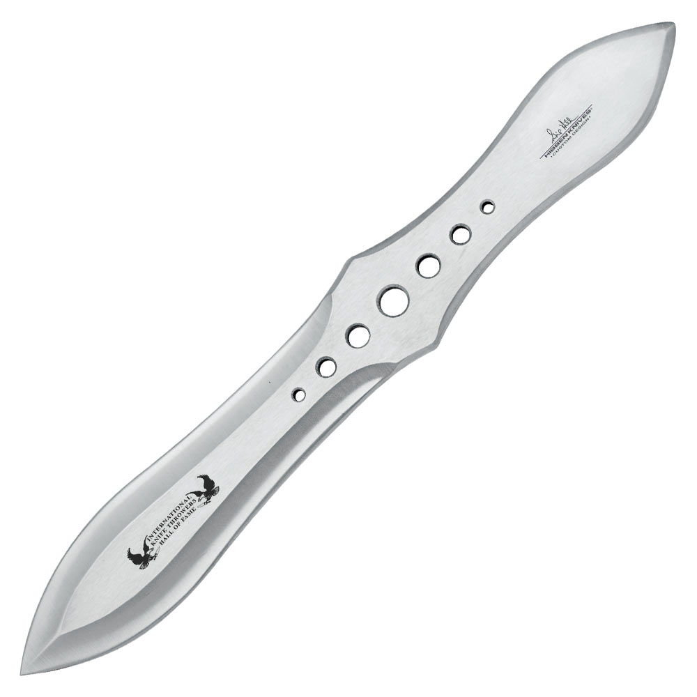 Legendary knife maker Gil Hibben has proven time and again he’s not afraid to journey into uncharted territory when it comes to forging some of the world’s best blades, and the Hibben Competition Throwing Knife Set is just the latest example of his knack for turning traditional designs into innovative, modern masterworks of bladesmith artistry. These razor-sharp knives really go the distance; like a majestic eagle soaring on a warm updraft, these 12 1/8” Hibben throwers fly gracefully through the air over astonishing lengths, thanks to sleek, aerodynamic lines and curves, and optimum weight and balance for throwing. Designed especially for pros and competition throwing, their advanced engineering makes it easy for even beginning knife throwers to hit their marks. And with tough one-piece 420 stainless steel construction, you’ll be able to hone that aim for a lifetime without fear of corrosion or damage. This set of three cleanly accented Hibben Competition Throwing Knives is housed conveniently in a single handsome genuine leather sheath, included along with an 18” x 18” paper competition target. If you’re a knife fan and haven’t tried the exciting and just plain ‘ol fun sport of knife throwing, what are you waiting for? Pick up a set of these top-notch throwing blades by master knifemaker Gil Hibben today!