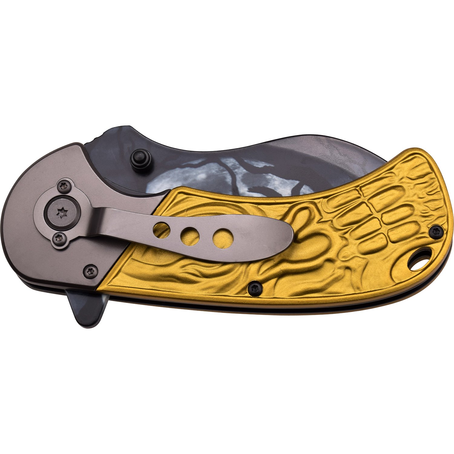 . Designed for attention and handy for daily cutting needs. The black finished, stainless steel spear point blade has a full moon heat transfer artwork, flipper, and thumb stud. It also has a partially serrated edge. The yellow aluminum die cast handle features a titanium coated stainless steel bolster and thumb ridge. It has a liner lock, a lanyard hole, and comes with a pocket clip.