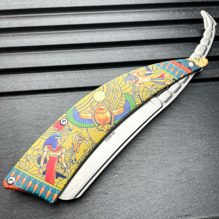 The mega-cool dark Side Blades straight razor. The knife is 8.75 inches long open length with a 3.75-inch stainless steel razor blade. 5-inch aluminum Egyptian artwork handle. Great item.
