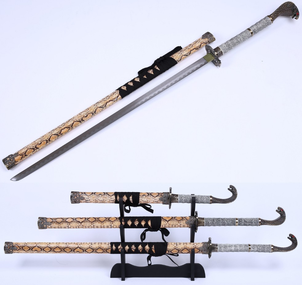 The swords are housed in elegant wooden saya, finished with a lifelike faux snake skin pattern and detailed with a black braid sageo. A durable three-tier table stand is included, offering a stylish and secure display option.