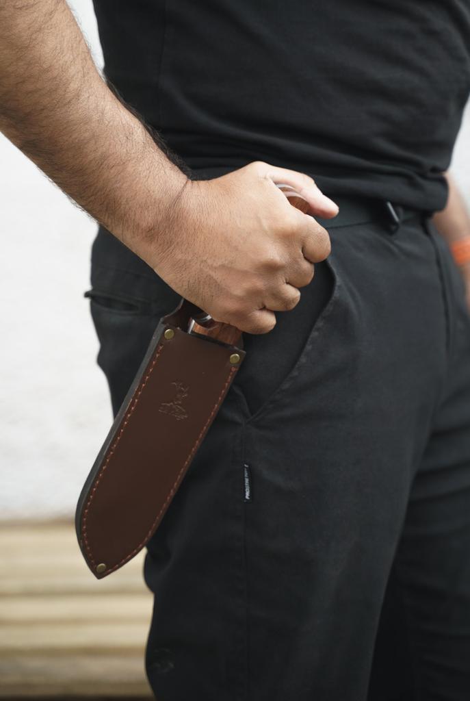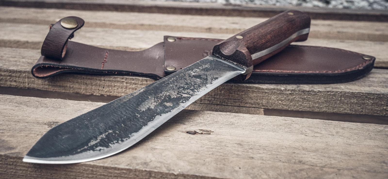 This cracking knife is made from quality materials. 65MN high carbon Bolo fine edge drop point blade provides an excellent balance of hardness and corrosion resistance. The cherry wood handles looks the real deal. Which it is. The knife can outperform blades costing many times its price. It has a thick 5mm spine with full tang construction. Highly recommended.