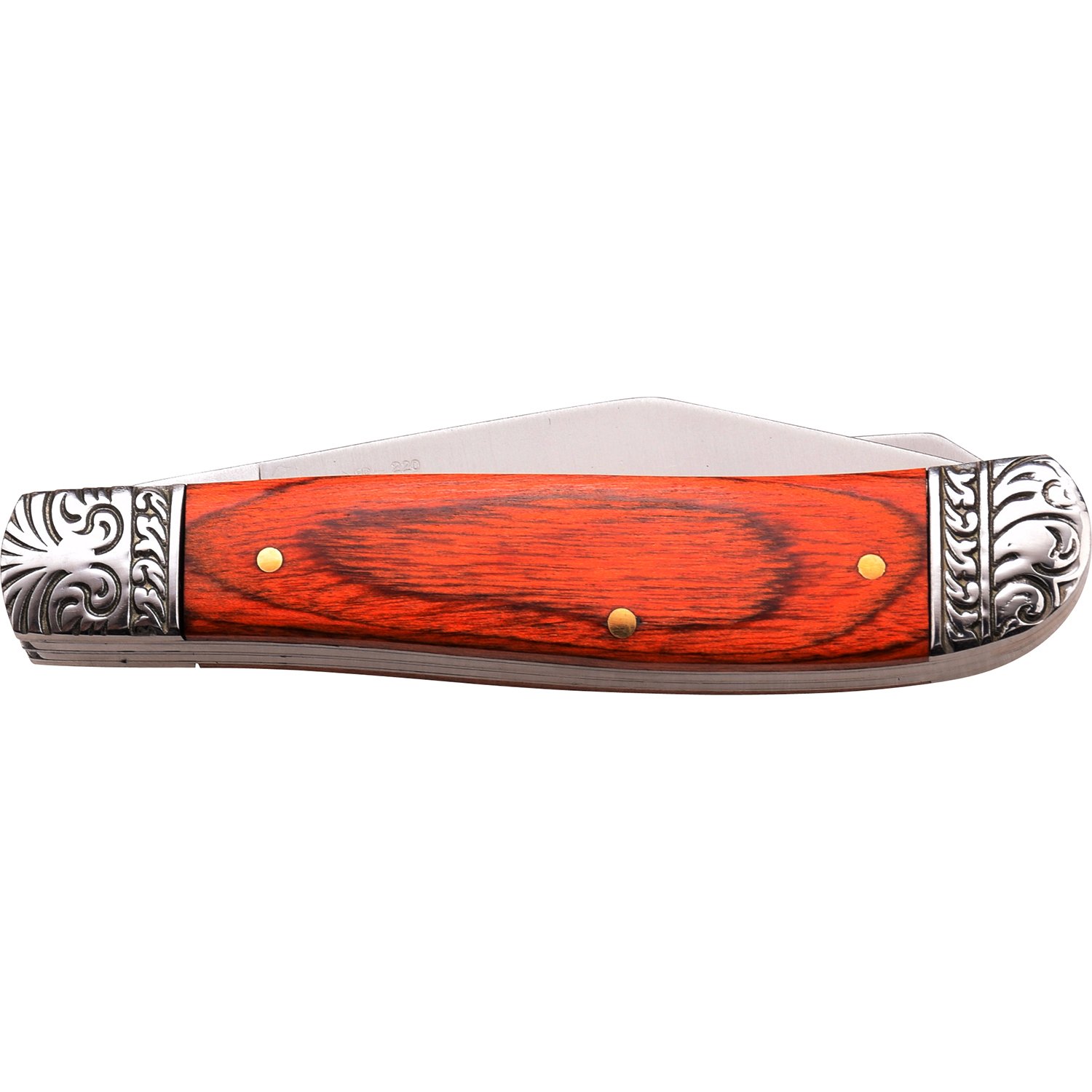 - DARK BROWN WOOD HANDLE WITH ENGRAVED FRONT AND END BOLSTERS
