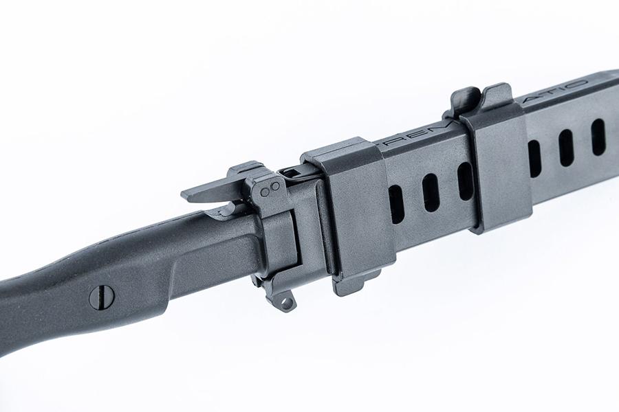 The sheath is equipped with a conical invitation to facilitate the reinsertion of the knife while a simple pressure on the trigger safety allows it to be extracted quickly and instinctively.