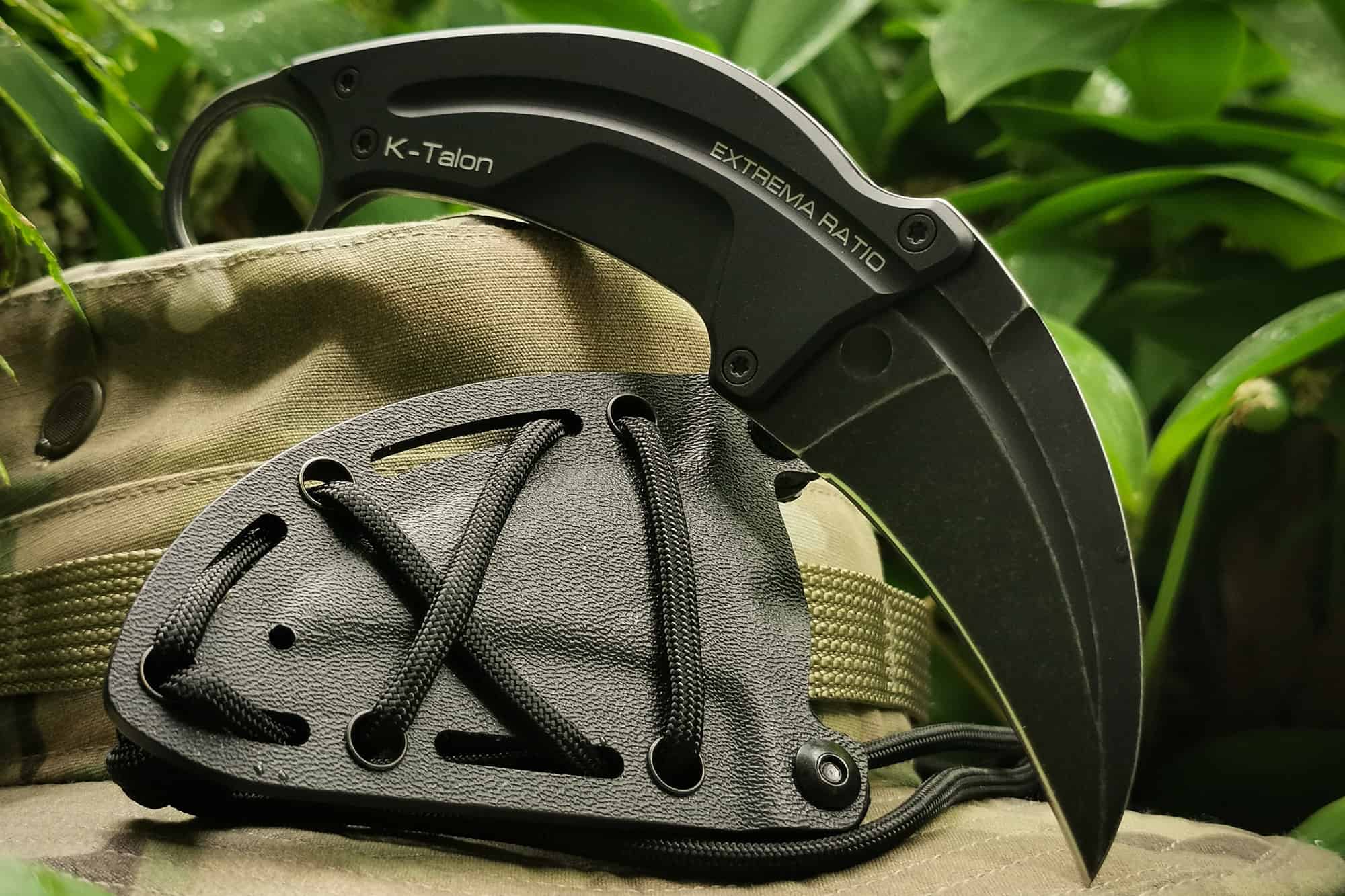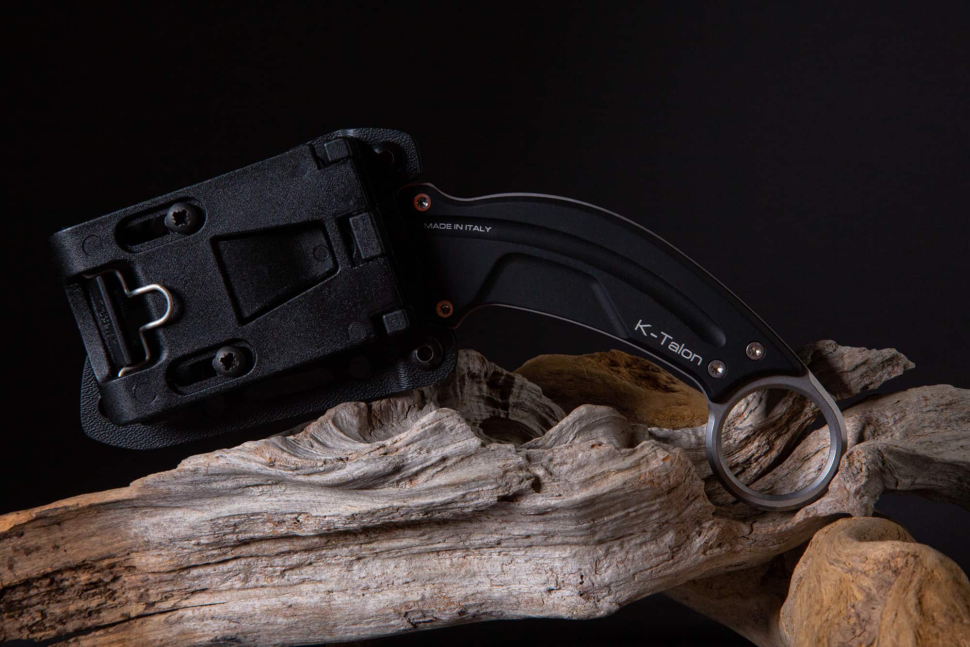 K-Talon is a karambit with a particularly thin full tang structure that, including sheath and scales, reaches a thickness of only 10 mm. The curved and hooked blade is designed inspired by the shape of a claw. It is designed to obtain precise and deep cuts and at the same time to hook, trap and/or tear. The rear ring is designed to obtain a strong and secure grip in all conditions, preventing the knife from slipping backwards and making it exceptionally difficult to slip. The very thin Kydex sheath has a quick release and is supplied with paracord that allows it to be used as a neck knife or to be attached to platforms with a MOLLE system. It can be accessorized with the following optional: