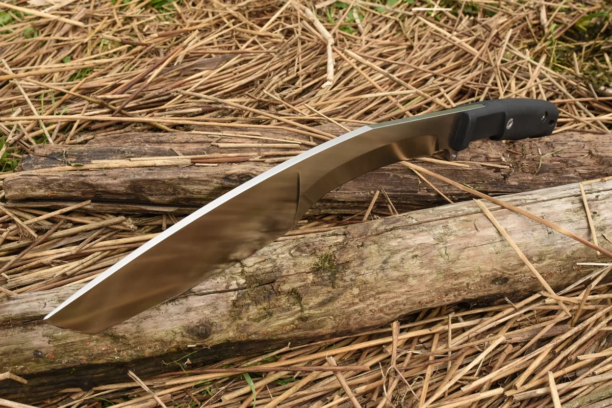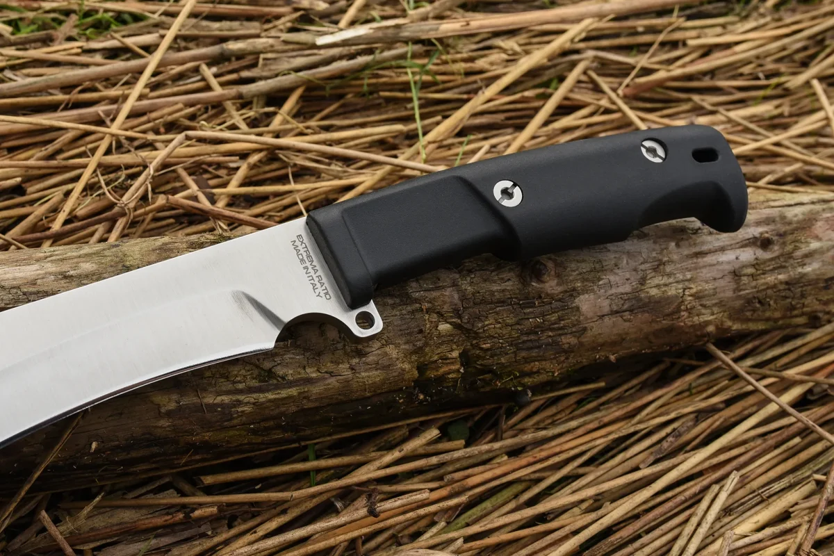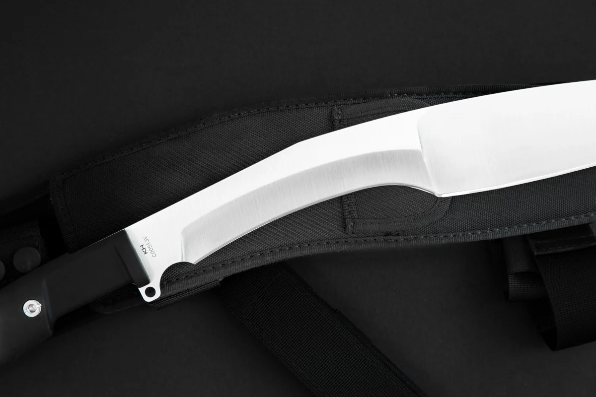 While similar tools are usually made of softer steel alloys for their elasticity and ease of sharpening, we were able to achieve adequate elasticity and a remarkably long-lasting edge using the hard Böhler N690 steel. This machete is equipped with a thigh sheath with a black Cordura pocket and a safety strap