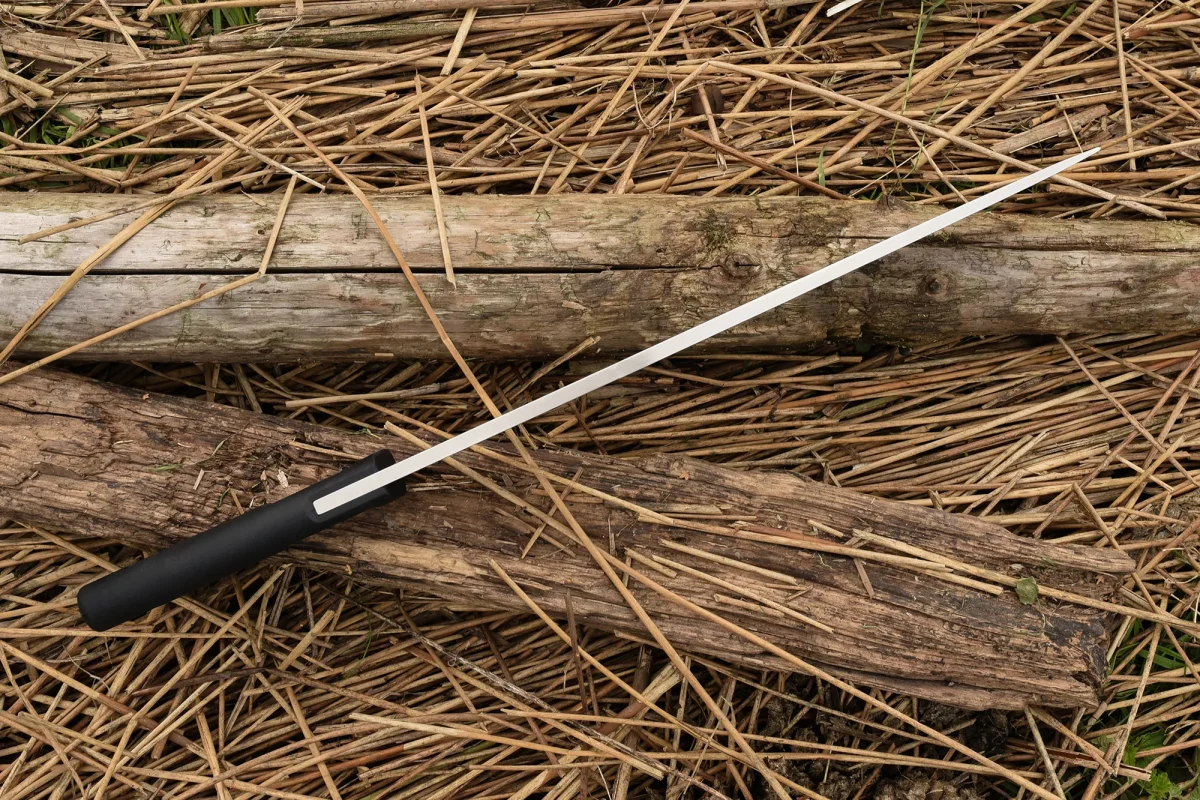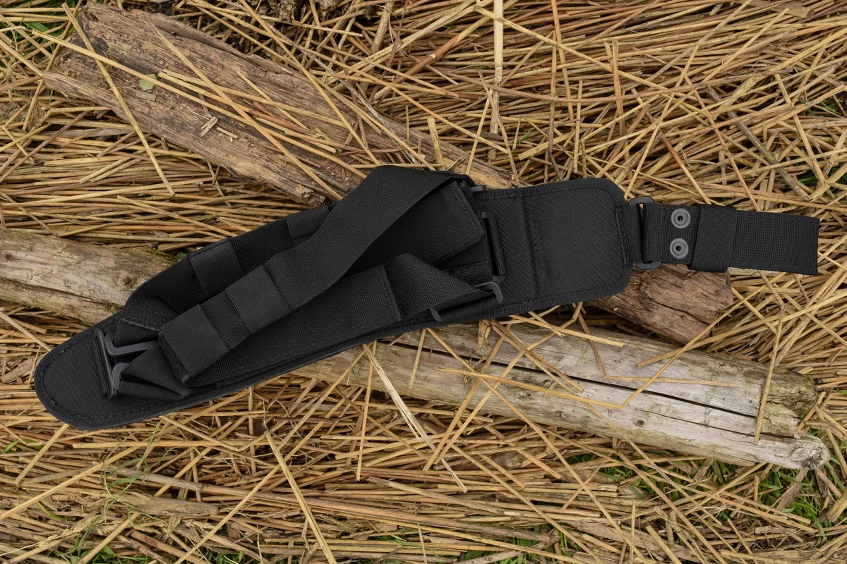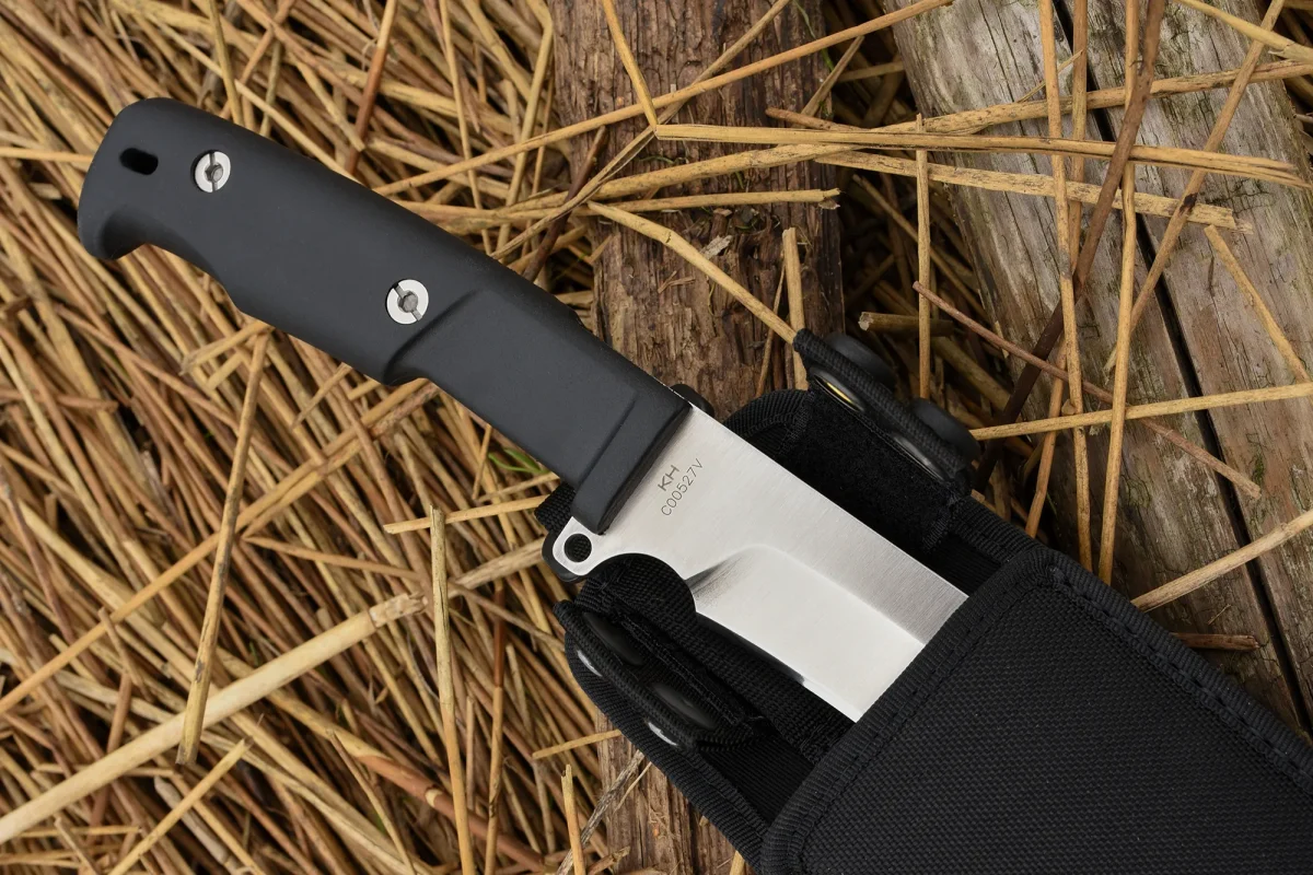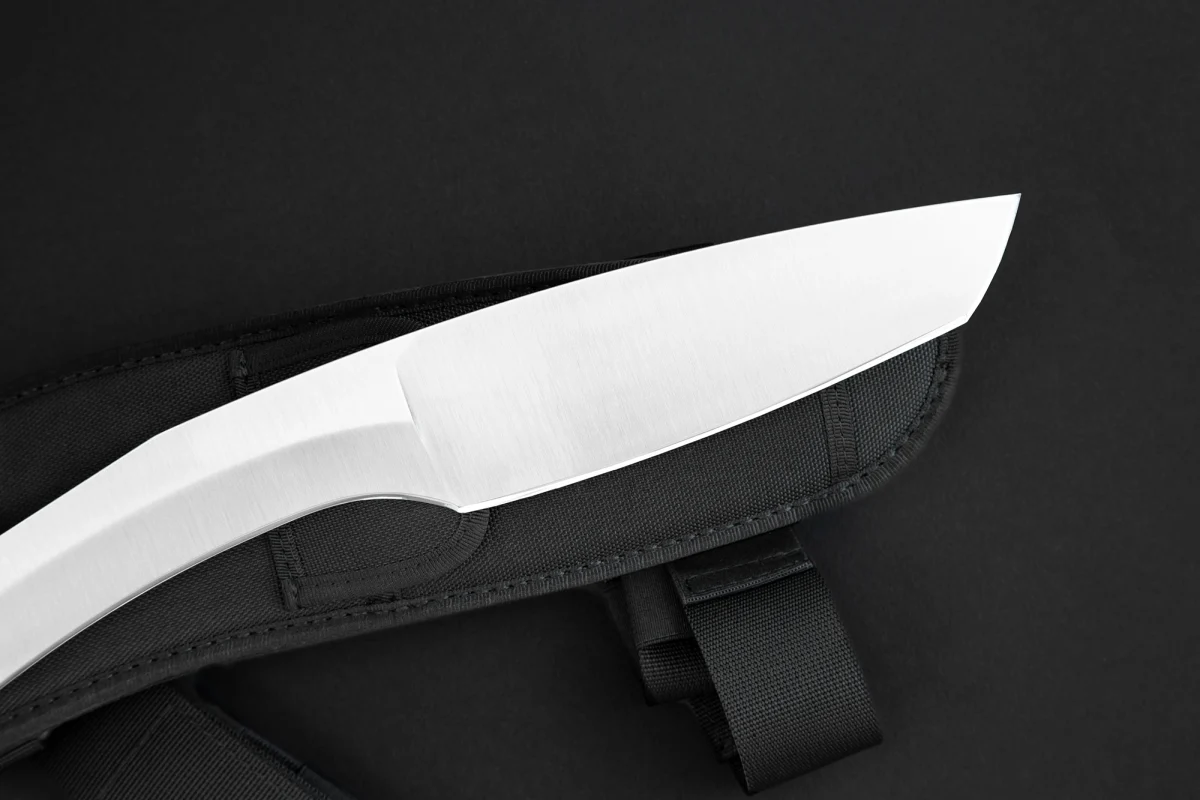 While similar tools are usually made of softer steel alloys for their elasticity and ease of sharpening, we were able to achieve adequate elasticity and a remarkably long-lasting edge using the hard Böhler N690 steel. This machete is equipped with a thigh sheath with a black Cordura pocket and a safety strap
