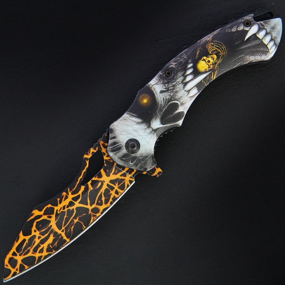 The handle, made from aluminum and measuring 12 cm in length, sports an artistic graphic—a skull accompanied by a yellow spider—adding a dramatic and unique touch. The vivid orange and black blade pattern resembles molten lava or cracked rock, further enhancing the knife’s standout appeal.