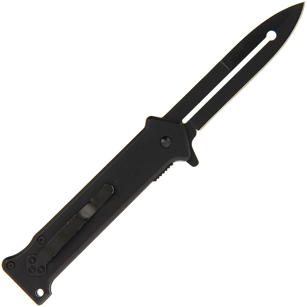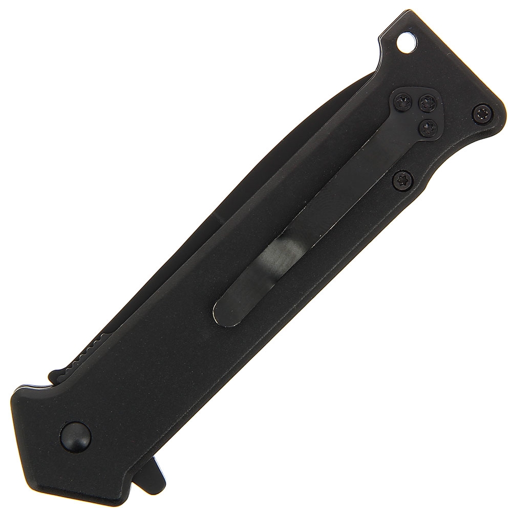 The Golan 390BK folding knife features a sleek 440A stainless steel blade, boasting a black finish and measuring 3.5″ in length, complete with a hollow groove for added functionality. The blackened stainless steel plates, paired with black anodized aluminum scales, exude both stability and durability. Further enhancing its usability are the flipper, lanyard hole, and pocket clip, ensuring effortless handling in any situation..