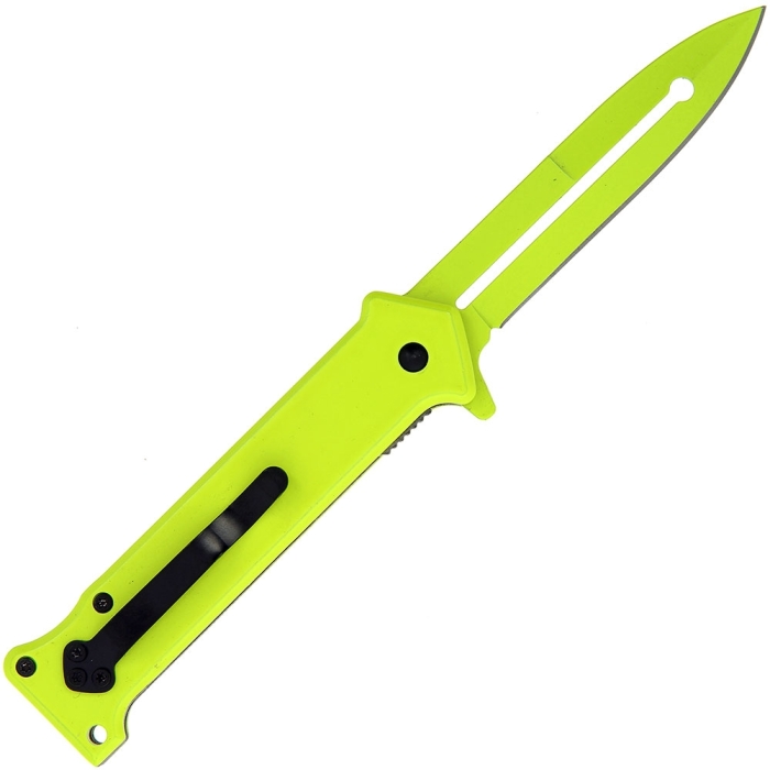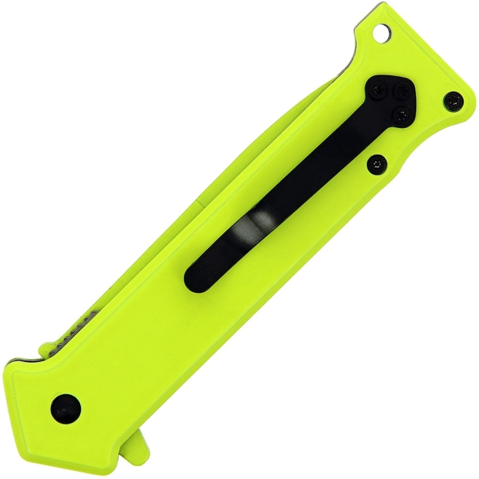 The Golan 390YL folding knife certainly craves attention, this vivid yellow knife features a sleek 440A stainless steel blade with a vibrant yellow finish and measuring 3.5″ in length, complete with a hollow groove for added functionality. This meticulous craftsmanship elevates it to a truly exceptional status among knives. The yellow stainless steel plates, paired with yellow coated aluminum scales, exude both stability and durability. Further enhancing its usability are the flipper, lanyard hole, and pocket clip, ensuring effortless handling in any situation.