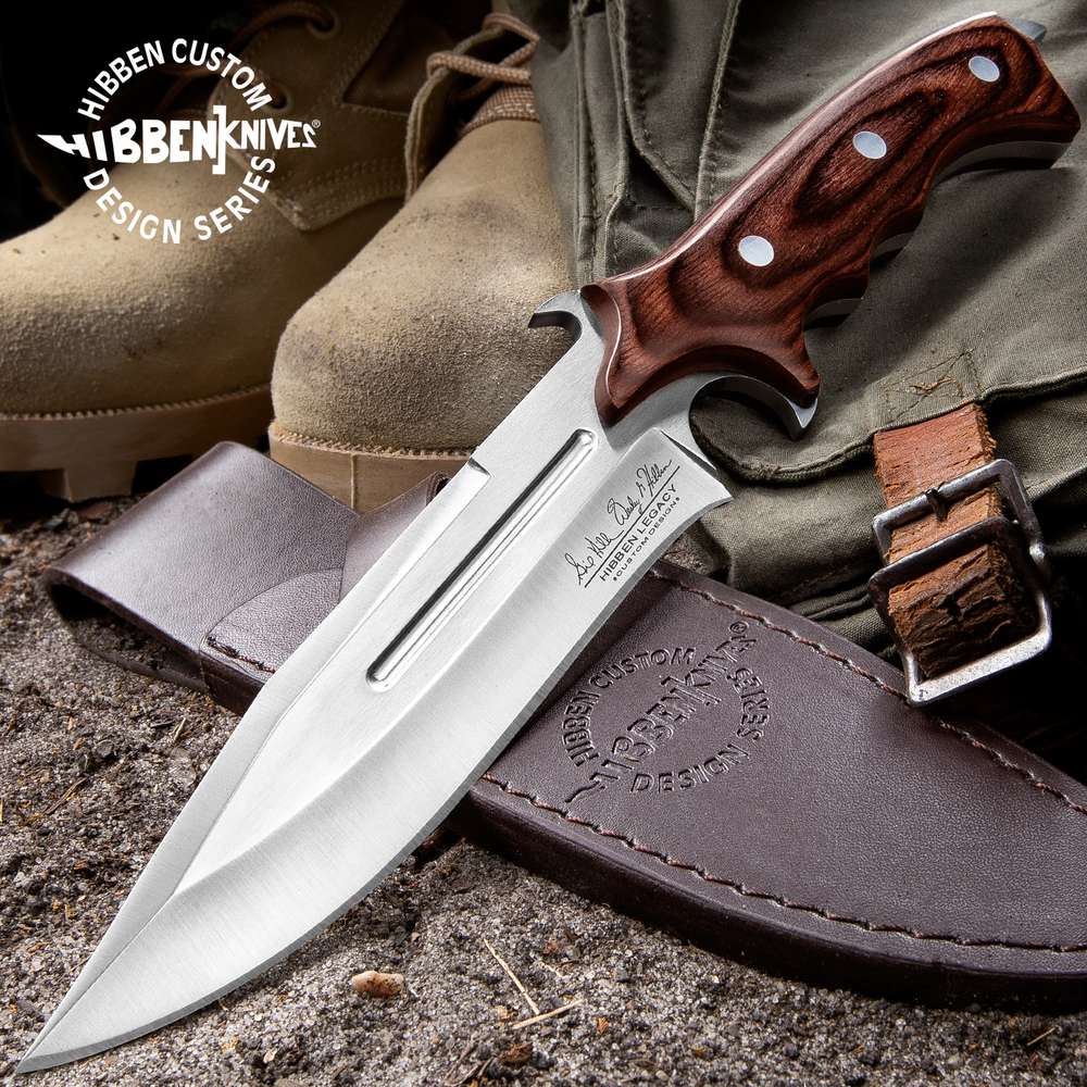 - The 12” overall knife comes in a custom leather sheath stamped with the “Hibben Knives Custom Design Series” logo