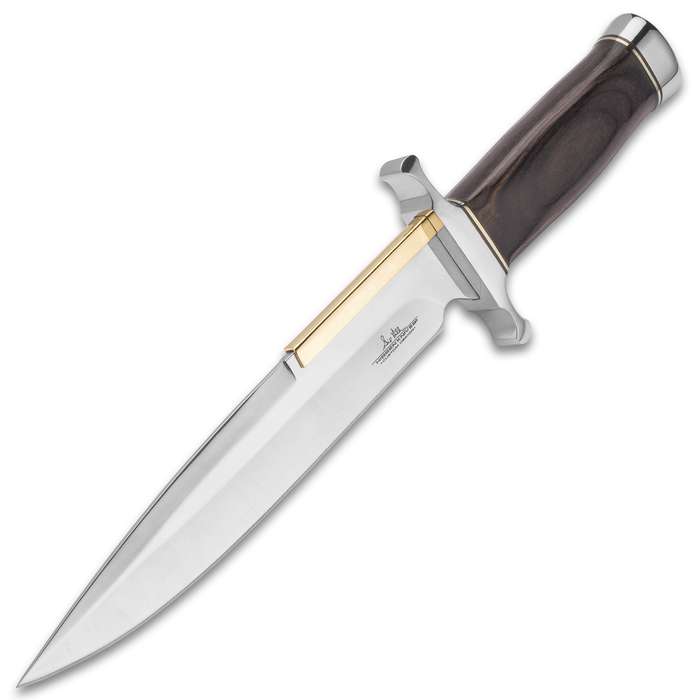 Gil Hibben reinterprets his famous “Old West” knife in the form of this brand new Hibben Old West Boot Knife. This handsome fixed blade features a 6 1/2″ mirror polished stainless steel blade with a brass spine plate. The attractive pakkawood handle provides an elegant finish with an Old West feel. A leather boot clip sheath is included. Measures 10 5/8″ overall.