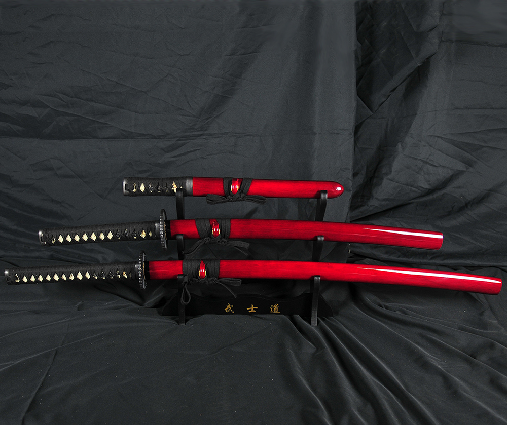 Engraved Monotempered 1045 Carbon Steel Blade set (Katana, Wakizashi and Tanto) with red saya. Great as a display piece and light to medium backyard cutting (fully tempered blade). Includes FREE three tier sword stand.