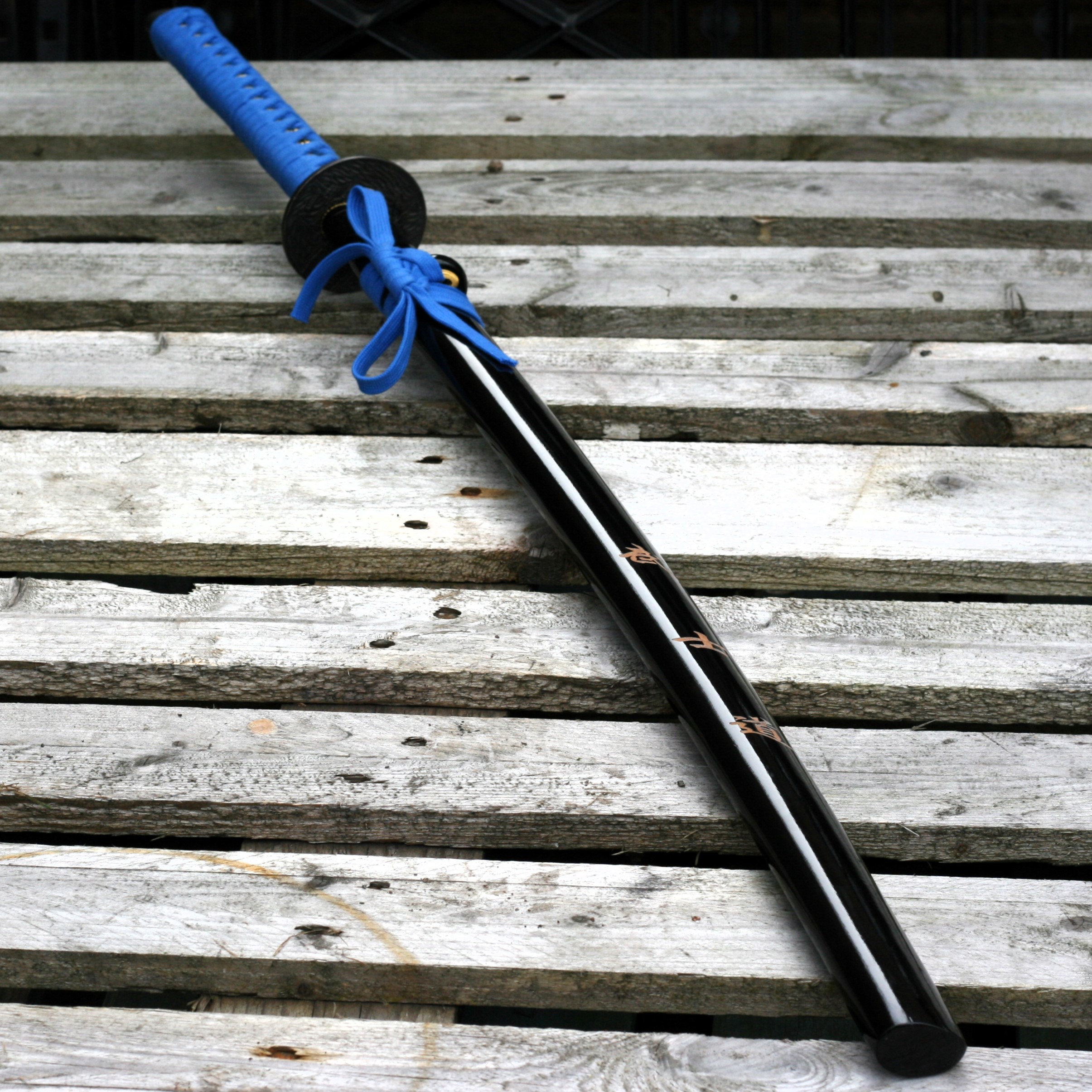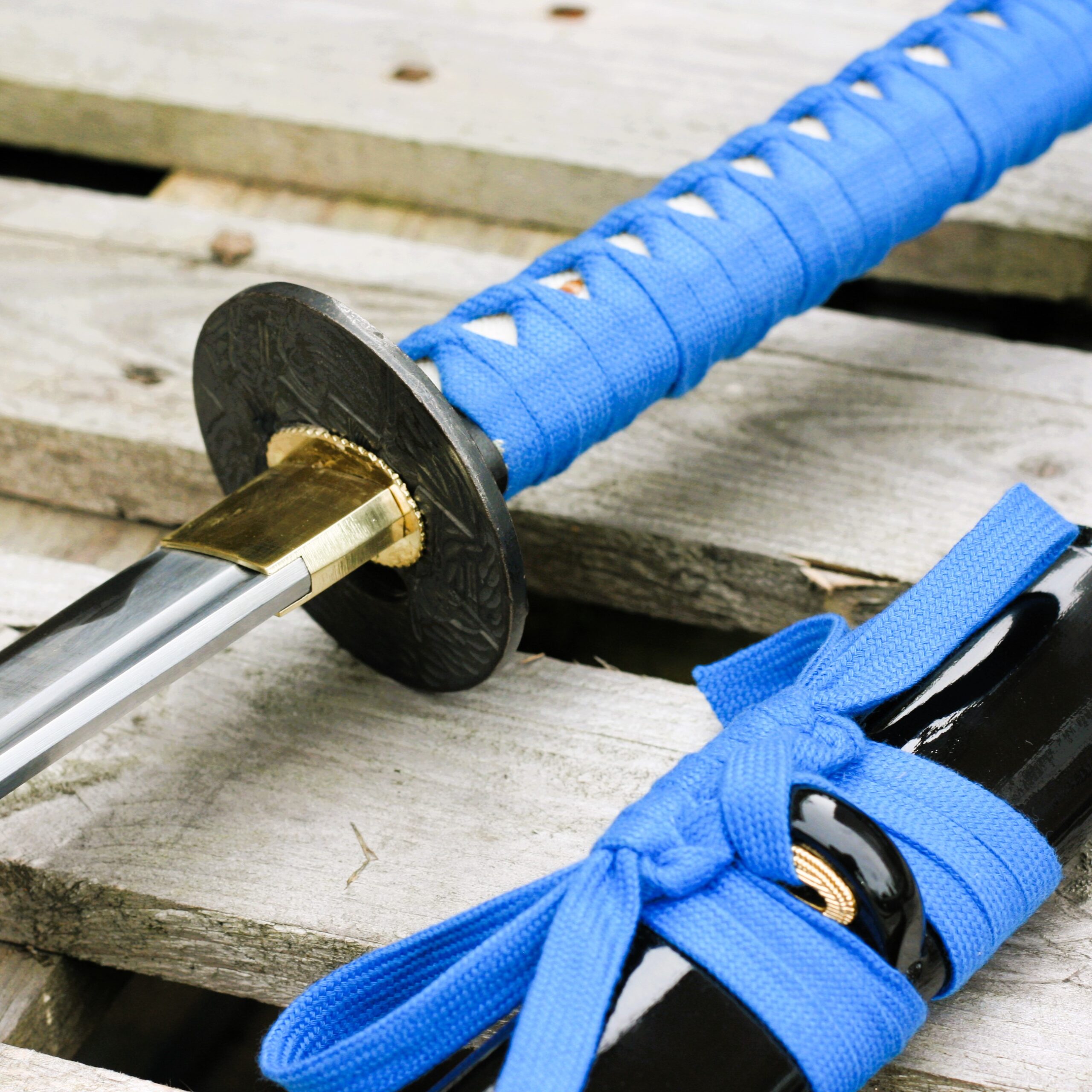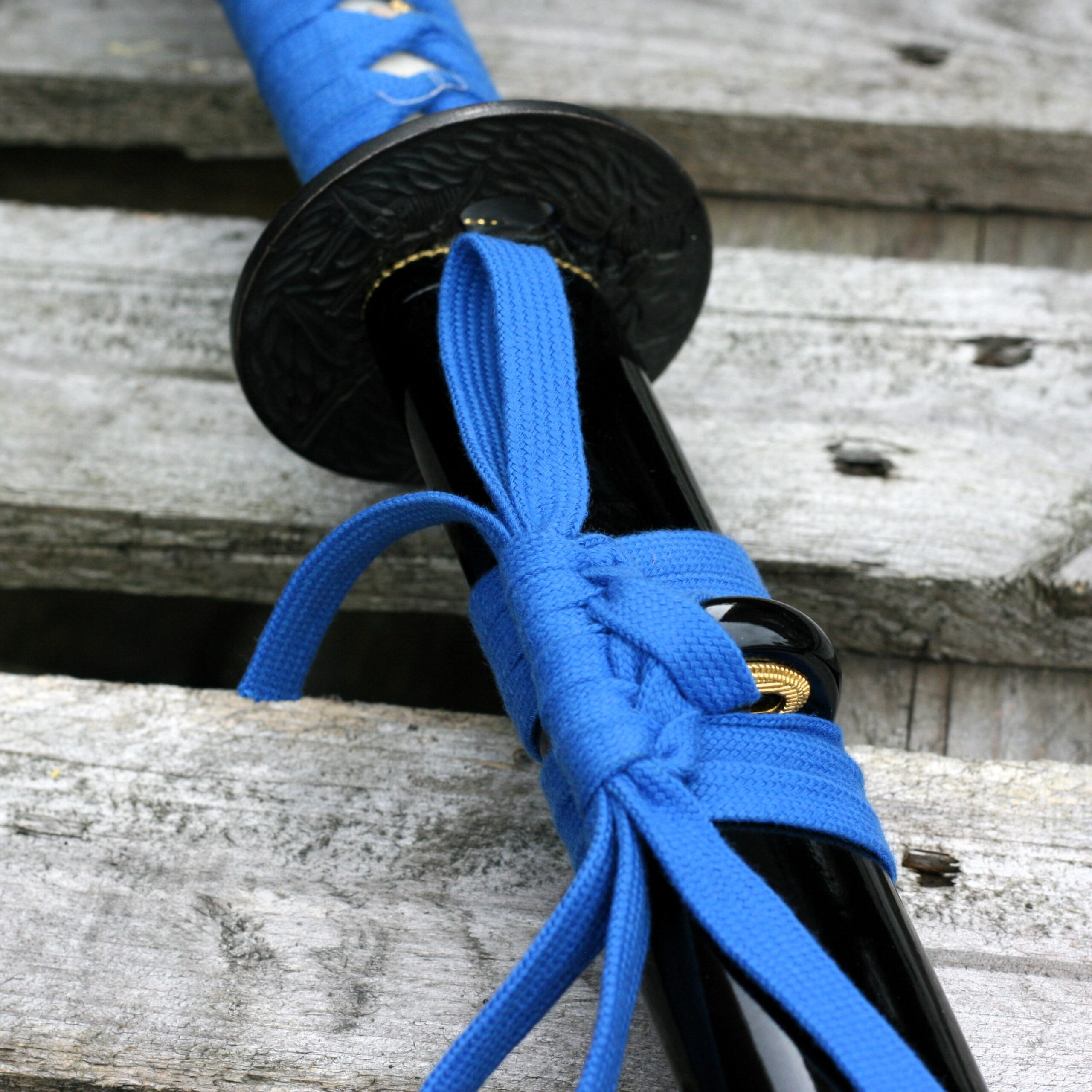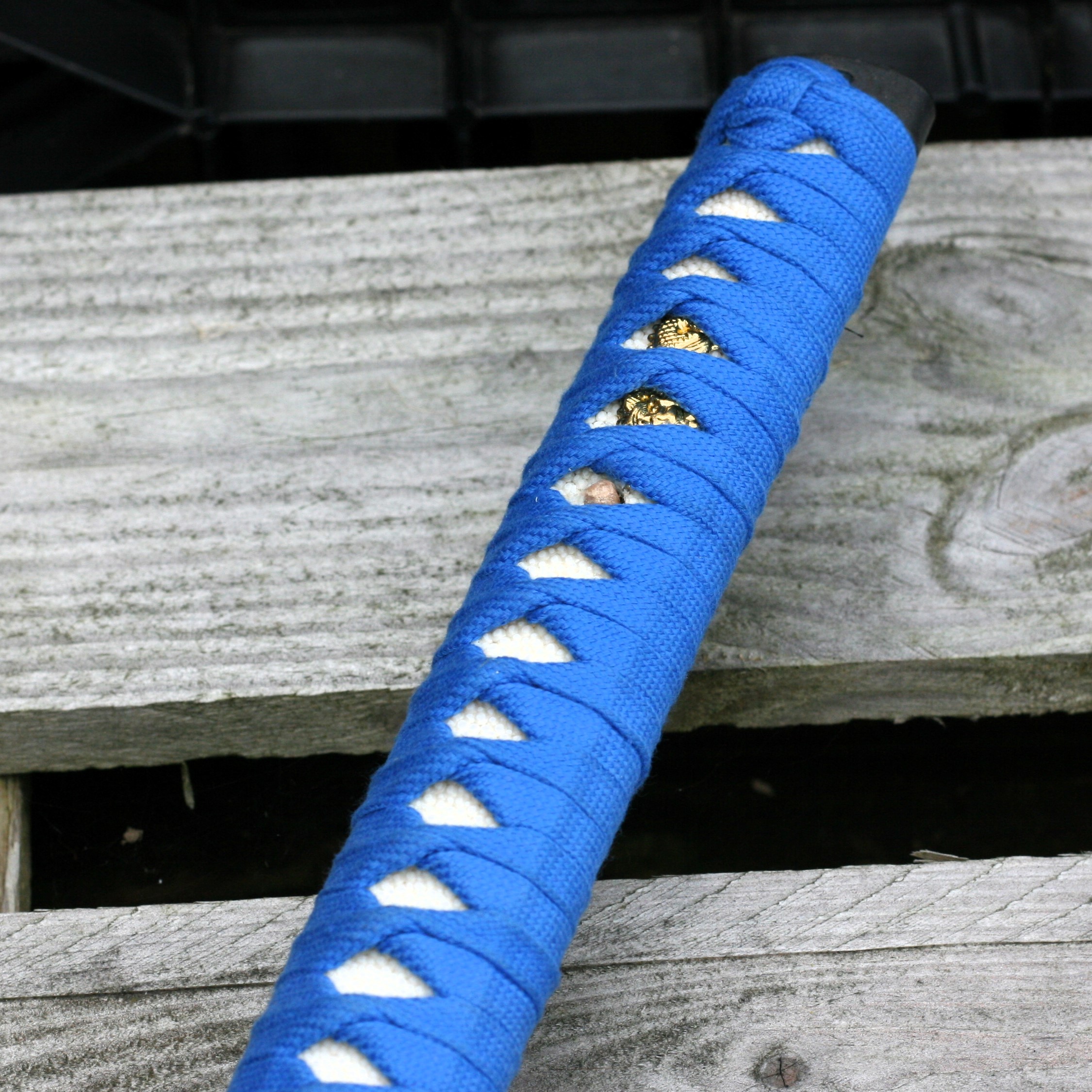 This handmade, traditionally hand forged katana, is made of folded steel. The folding process removes impurities from the steel, leaving only the finest quality steel without weak spots. It’s hammered and heated and hammered and heated until the perfect blade is formed, then quenched for the perfect hardness before finally receiving a temper to knock back any chance of becoming brittle. The wooden handle is wrapped in genuine Stingray skin (Samekawa) before the traditional handle wrapping (Tsukamaki) in blue cotton.