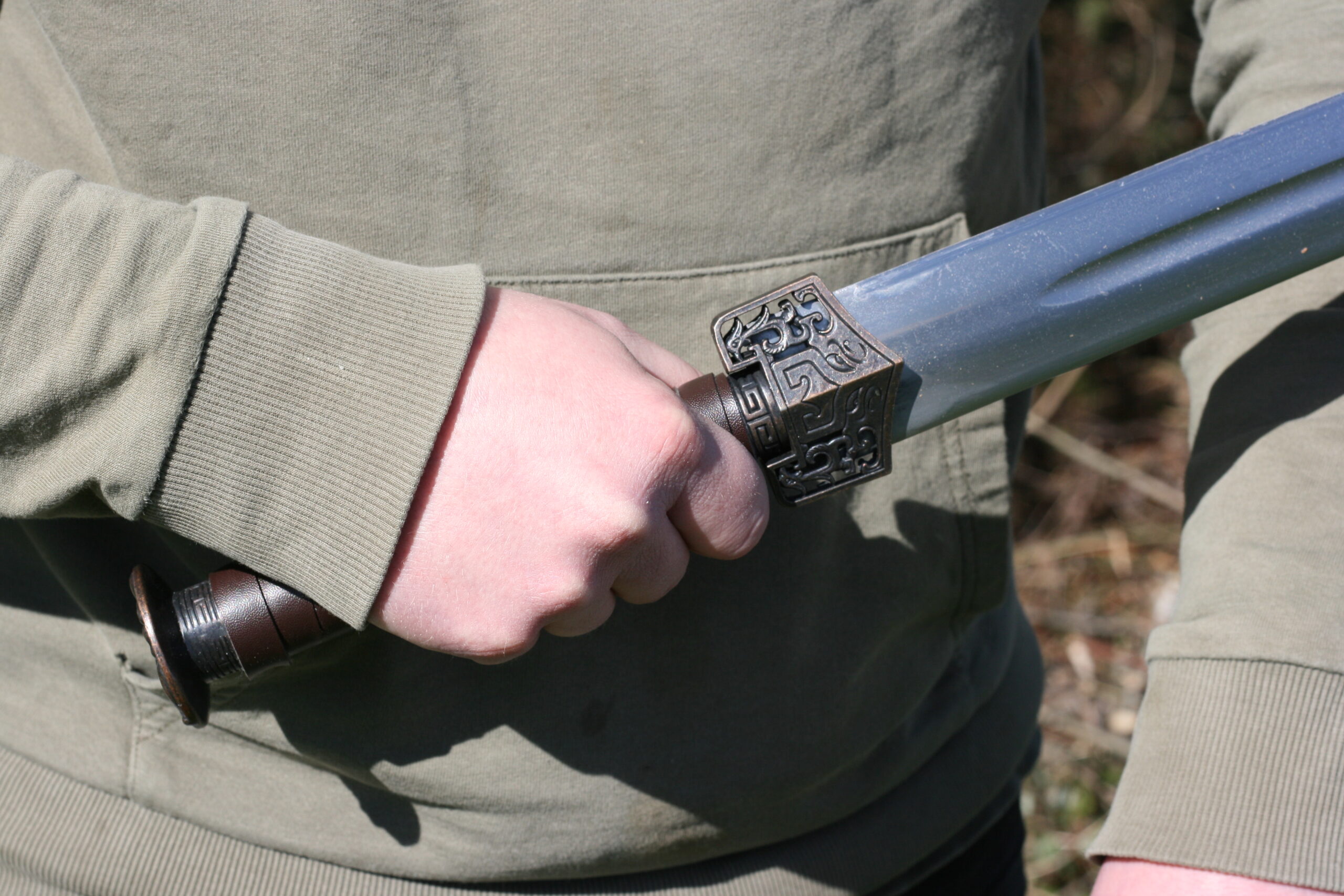LEATHER WRAPPED HANDLE WITH ANCIENT CHINESE ART ON POMMEL