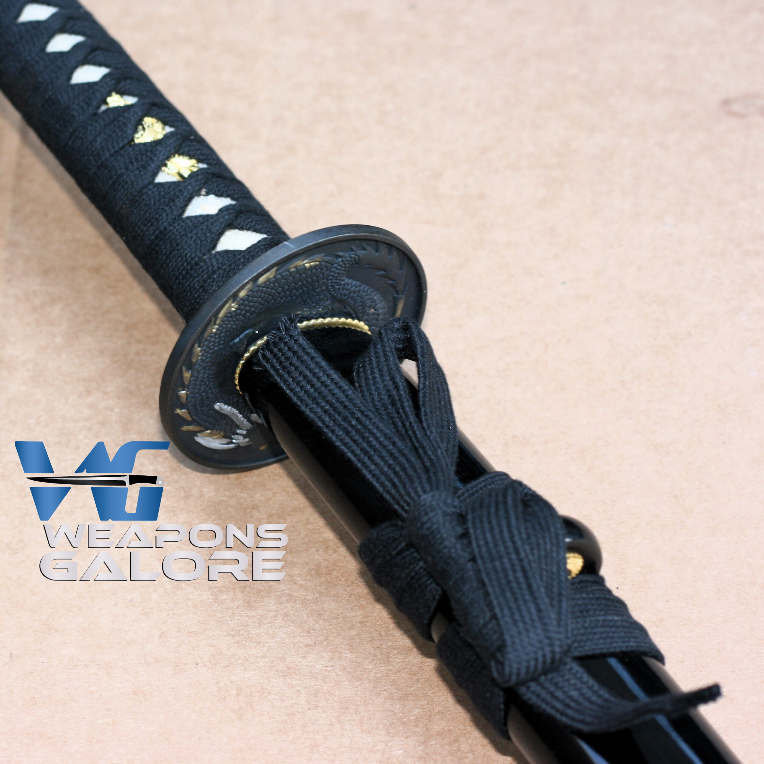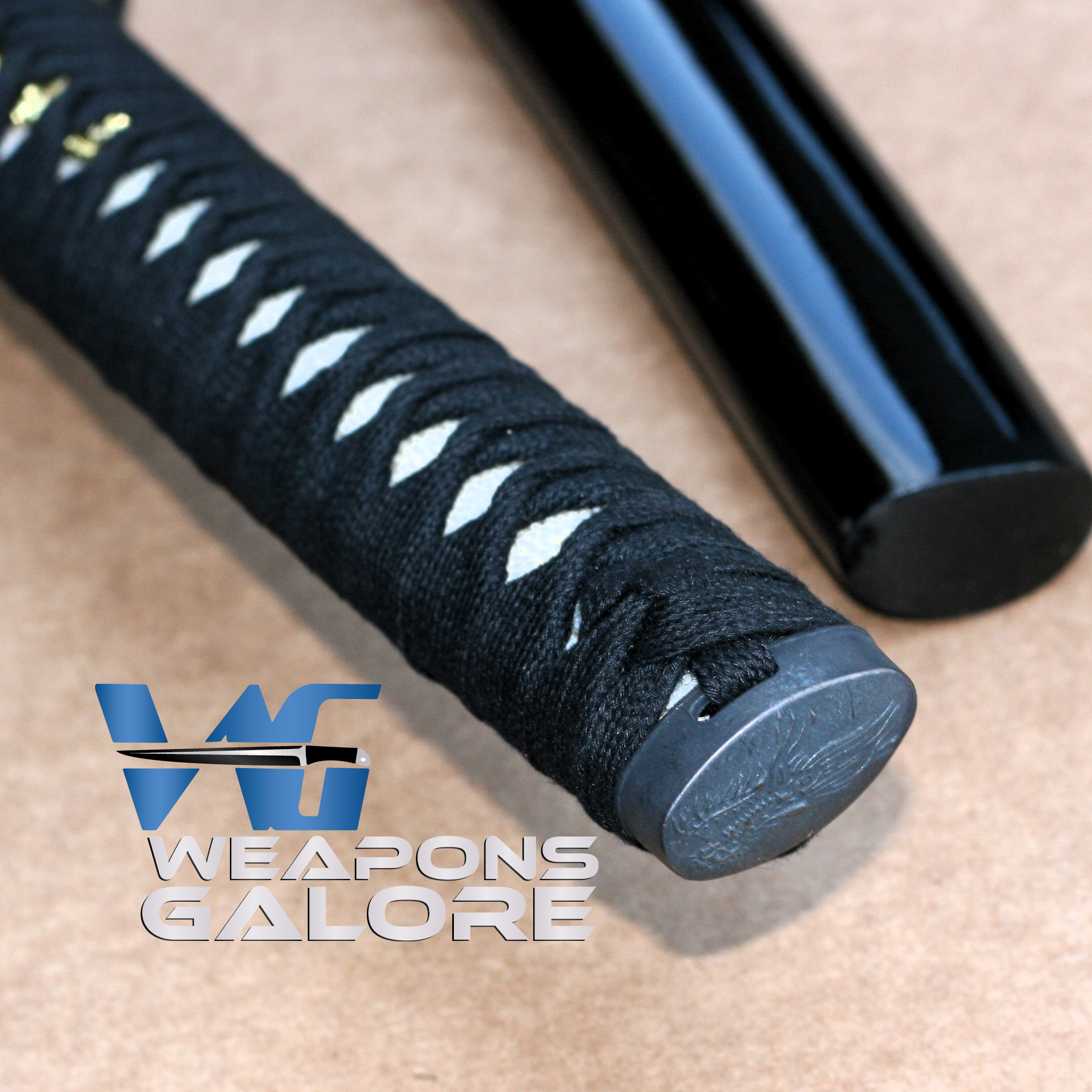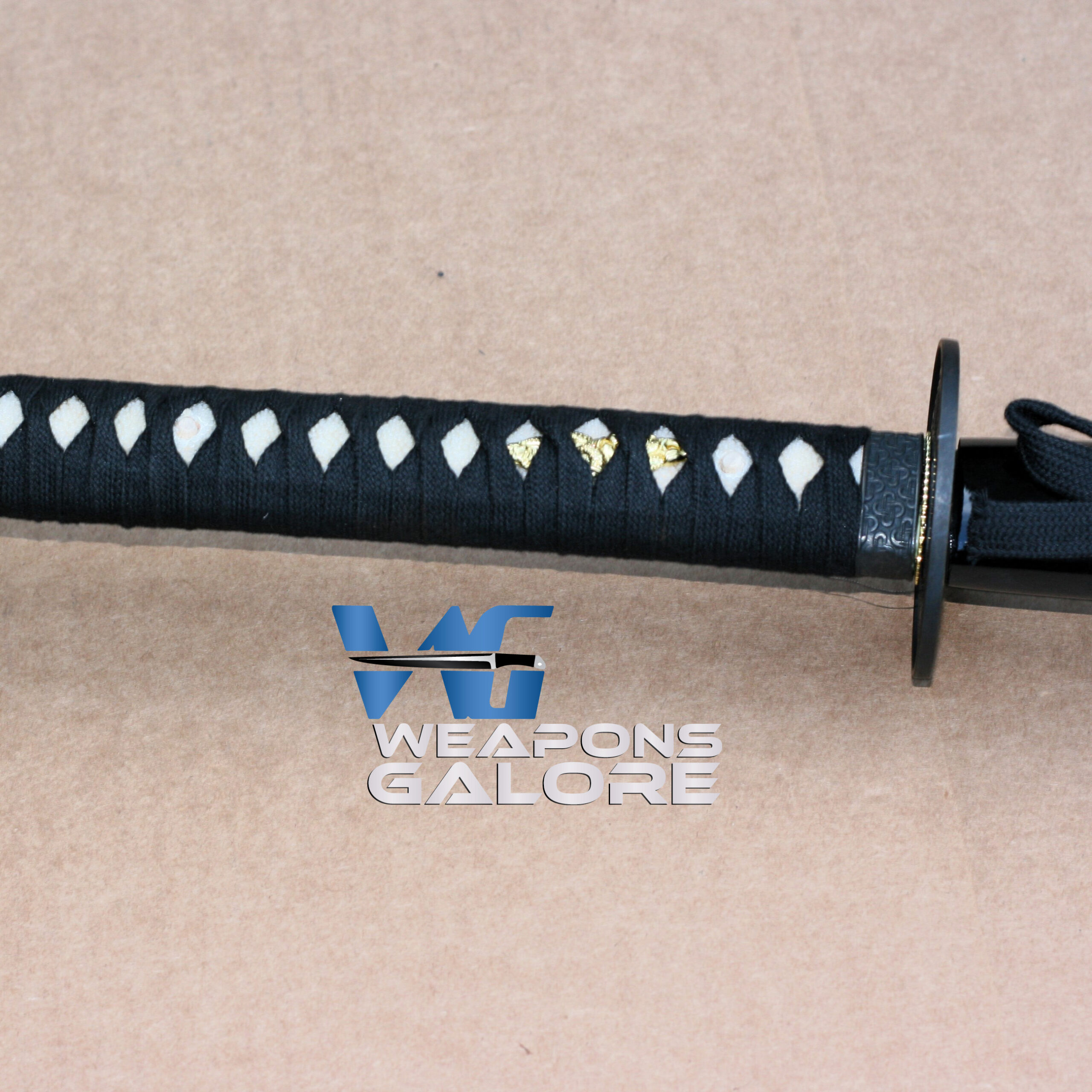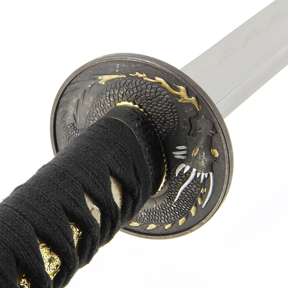This Japanese dragon katana comes with a 72cm medium carbon steel blade. The sword measures 102cm overall with a 7.2mm thick spine. Notably, this means it’ll reduce bending if your swing isn’t perfect. The blade includes a fuller or ‘bo-hi’ in Japanese that will whistle when swung with perfect alignment. You’ll find that the wire-brushed faux hamon adds to the authentic appearance of this Japanese sword. If you’re looking for an impressive display item, that doubles as a functional sword – this is the piece for you.