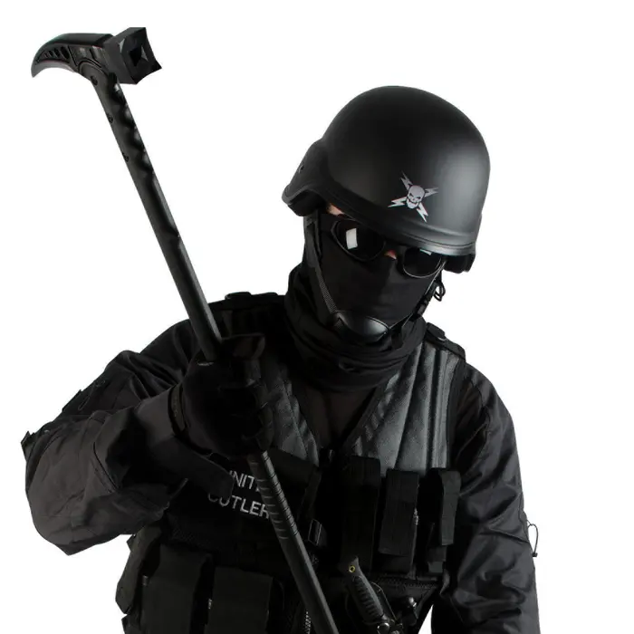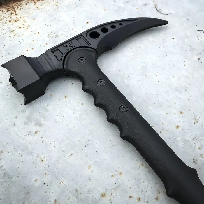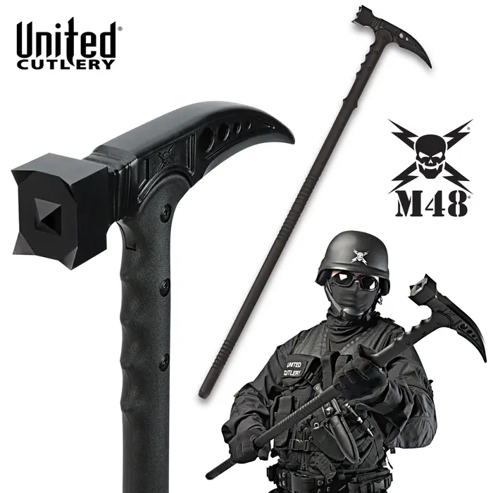 The M48 Tactical Survival Hammer from United Cutlery is the perfect companion for hiking and camping. With a 37 3/8″ overall length, it’s great as a walking staff, and the cast stainless steel, the black oxide-coated head can pound practically anything into submission with ease. The curved back spike is an effective breaching tool and a great defensive alternative to the stout hammerhead. The spike and hammer together make an excellent handle for a fully functional walking cane. The 30 percent fiberglass handle is nearly indestructible, and the hammerhead is attached to it with metal bolts. The shaft includes a rubber toe on the end for improved traction.