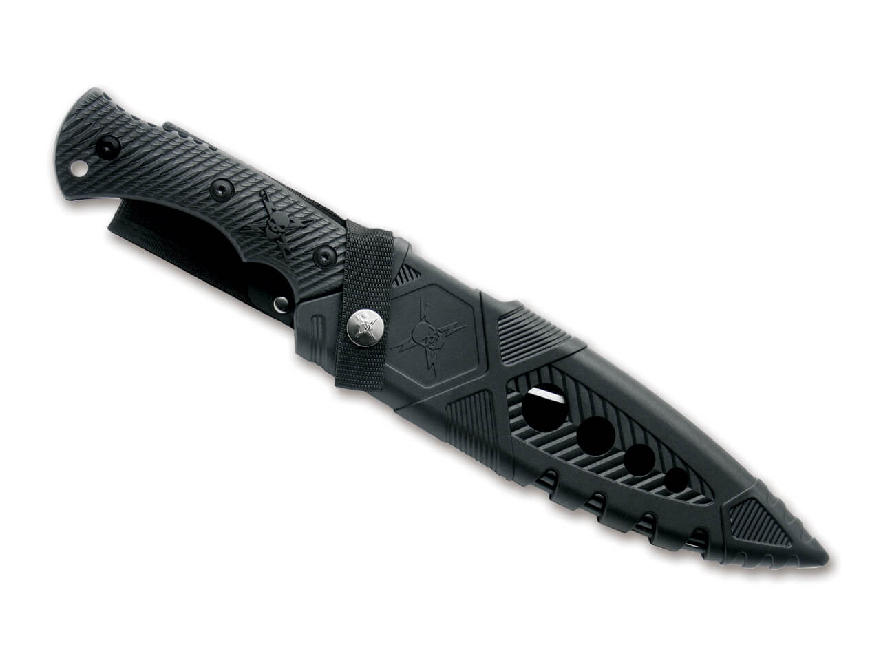 The 13 1/2” fixed blade knife slides securely into an injection molded Vortec and nylon belt sheath, which has a snap closure strap