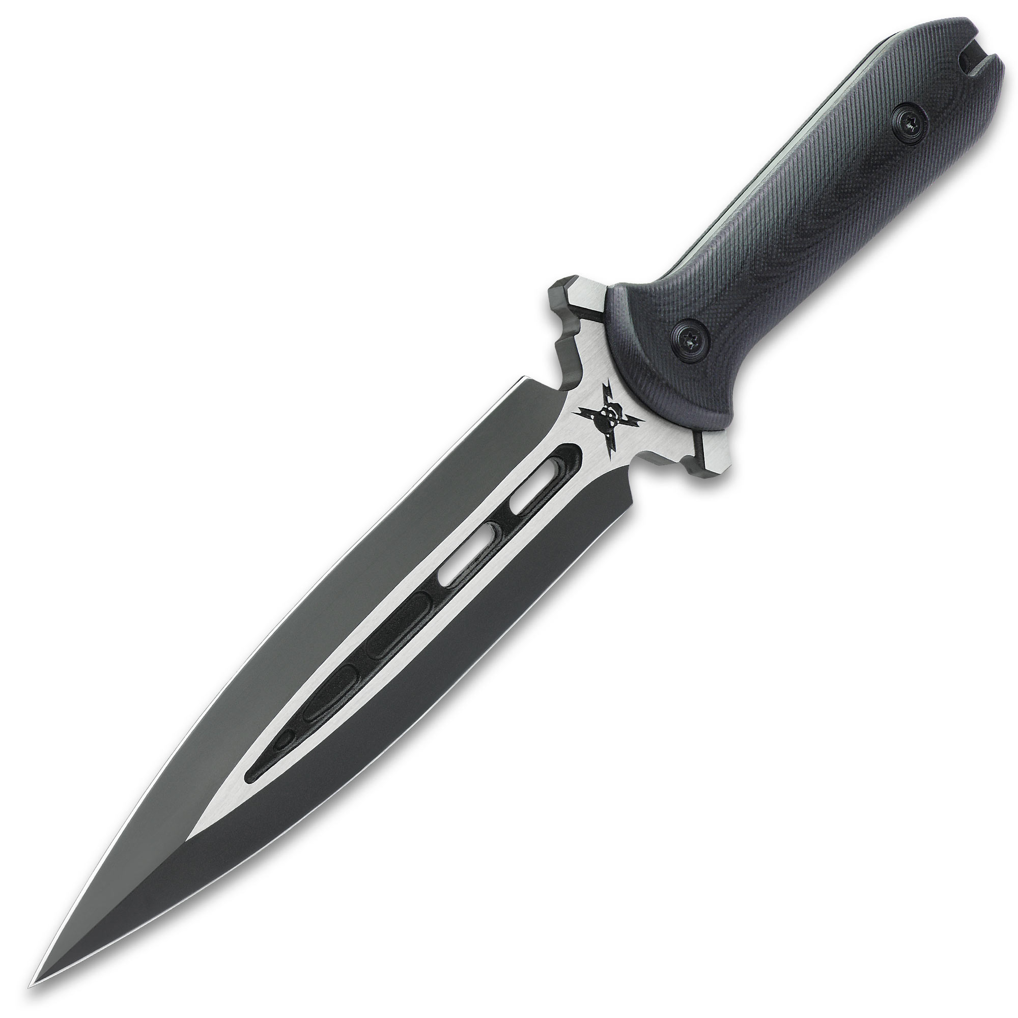 It has a 3/8″ thick, 6 7/8” cast stainless steel dagger blade with a black oxide coating and satin finish highlights