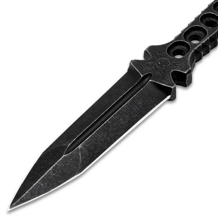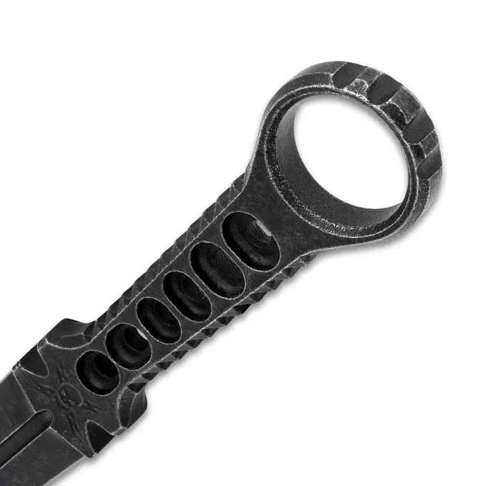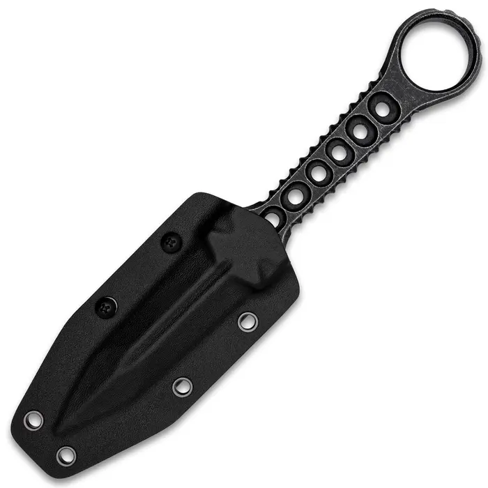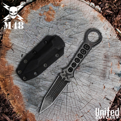 The M48 Tanker  Dagger is an absolute beast of a fixed-blade knife that’s built like a tank. It has a one-piece, CNC machined 3Cr13 stainless steel, solid and heavy-duty construction with a stonewashed finish. The dagger has a hefty, 4 1/4” double-edged blade that goes down to a sharp penetrating point and it has a blood groove. The ridged and perforated handle is grippy and the open-ring pommel provides an extra measure of control when using. The 9 1/2” overall dagger snaps securely into a tough Kydex sheath with a metal belt clip and lashing holes.