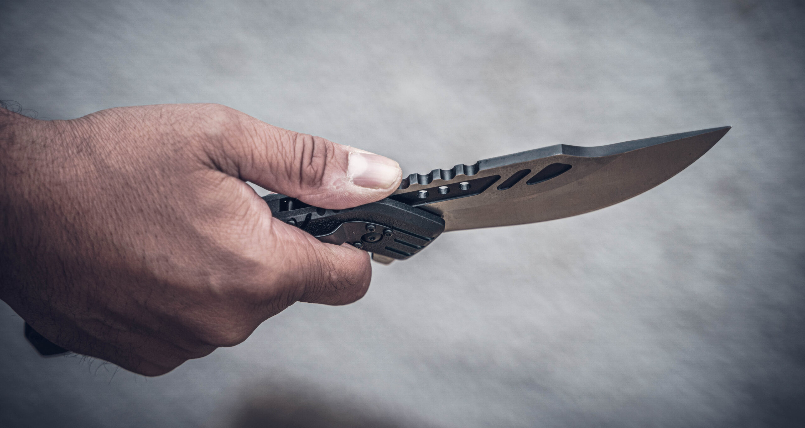 The black, textured handle is tough, injection-molded nylon, and has a finger-grooved grip and jimping on the back end.