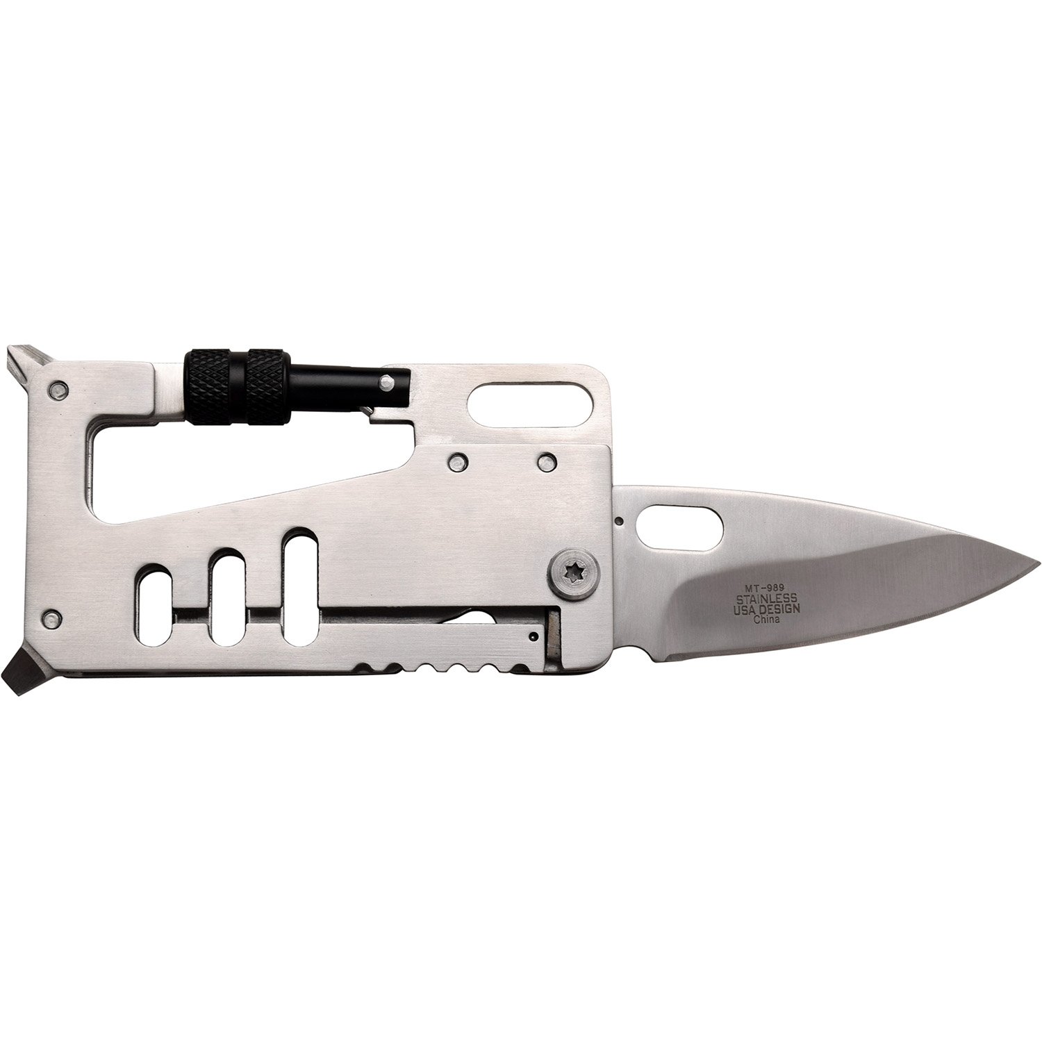 This beauty actually fits into your wallet. Multi-Tool Knife Gray. Multi-Tool Knife. 3.25 inches closed. 2.25-inch satin-finished stainless blade. Black and gray anodized aluminum handle. Lanyard hole. Thumb pull. Tools include Bottle opener l Carabiner l Phillips screwdriver l Small screwdriver.
