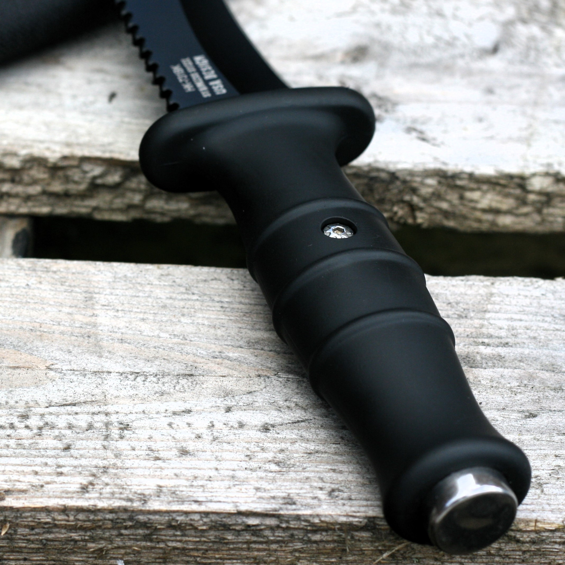 Evoking the design of a Kukri knife, this fully recurved blade is 7.5 inches in length and features a false edge on the spine, a gut-hook for skinning, and a serrated section for cutting through fibrous materials. The blade is crafted from blackout-coated stainless steel to prevent rust and corrosion.