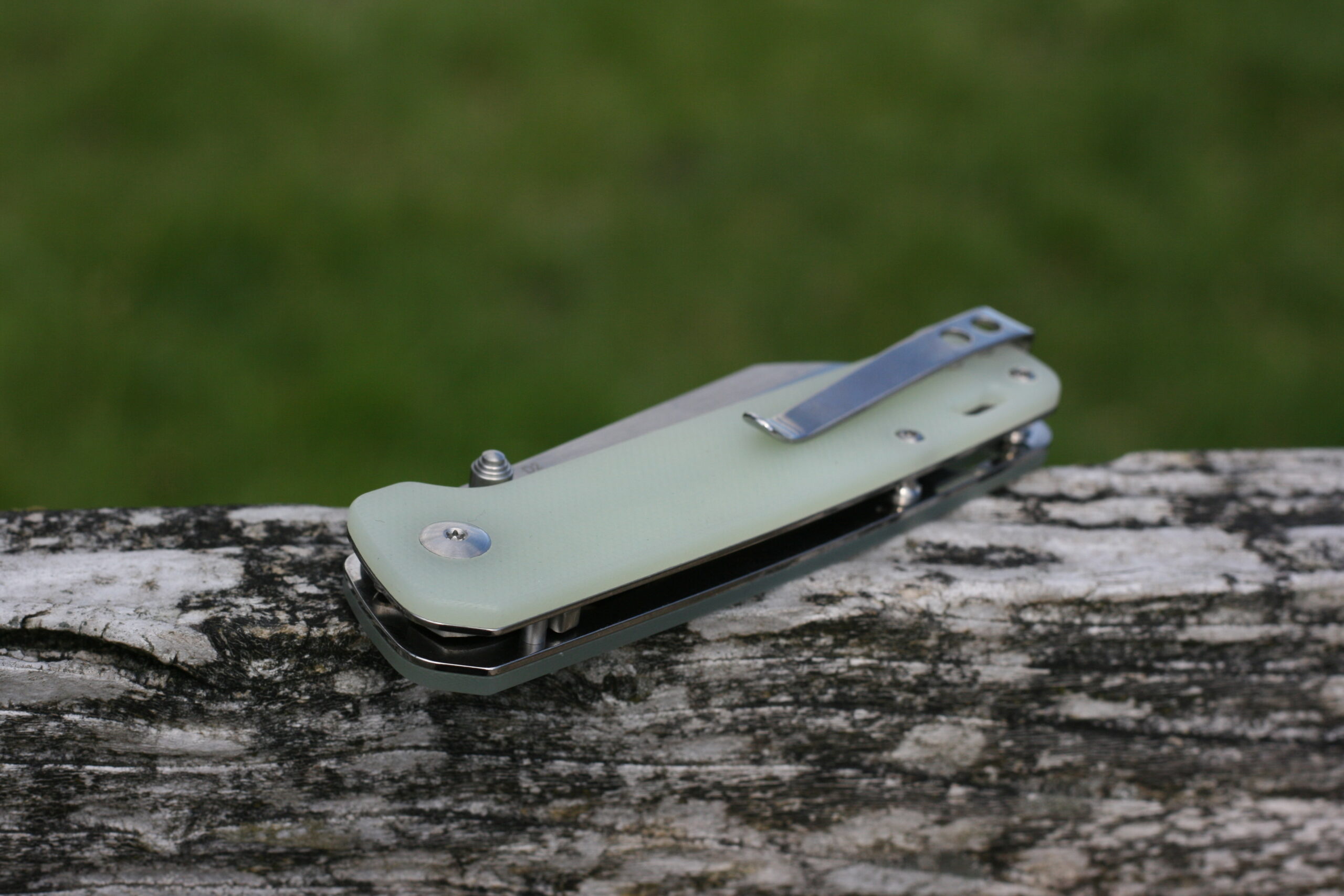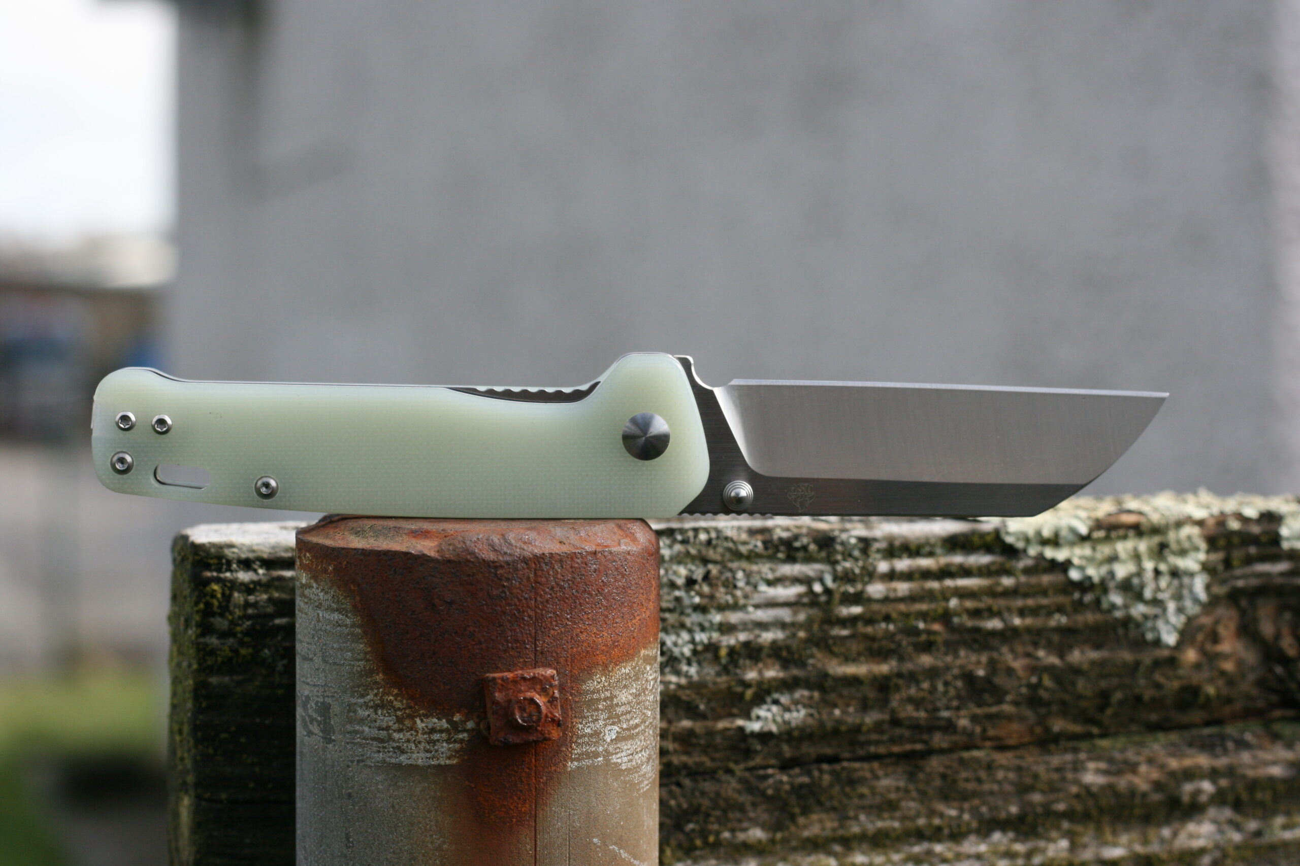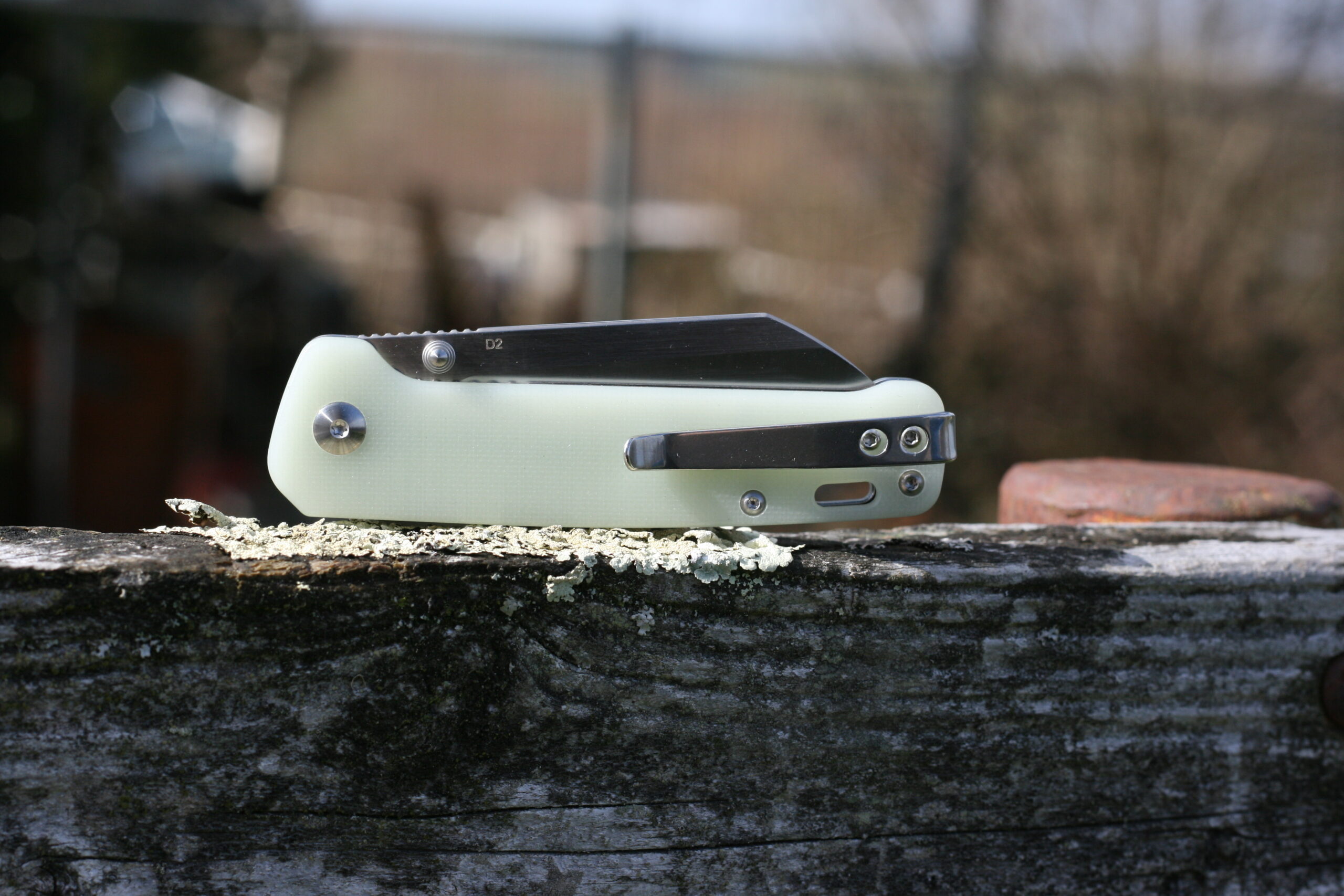 The Penguin folder provides a handy blade for chopping and slicing that really gives you a bang for your buck. The D2 blade features a sheepsfoot design that excels at slicing and chopping tasks due to its large straight edge. The blade is deployed via a thumb stud and is exceptionally smooth to operate thanks to the copper washer pivots. The handles are made from Micarta/ G10 / Carbon Fibre  that is lightly textured to give a grip but still comfortable to hold. The knife comes with a reversible deep carry pocket clip and fits perfectly in a pocket.