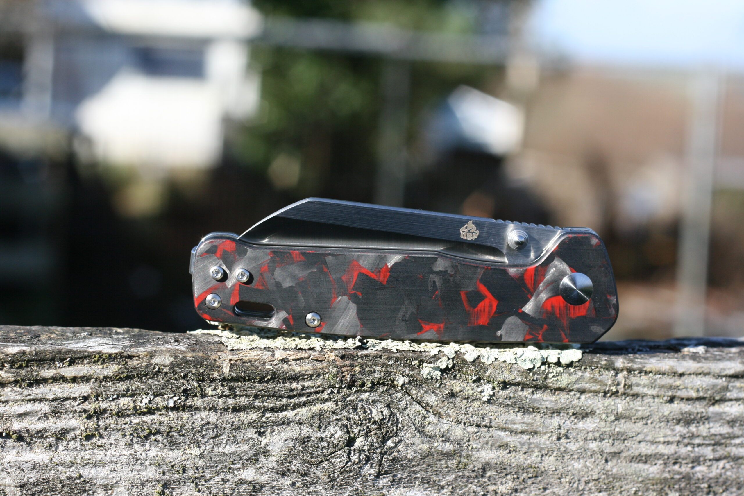 The Penguin folder provides a handy blade for chopping and slicing that really gives you a bang for your buck. The D2 blade features a sheepsfoot design that excels at slicing and chopping tasks due to its large straight edge. The blade is deployed via a thumb stud and is exceptionally smooth to operate thanks to the copper washer pivots. The handles are made from Micarta/ G10 / Carbon Fibre that is lightly textured to give a grip but still comfortable to hold. The knife comes with a reversible deep carry pocket clip and fits perfectly in a pocket.