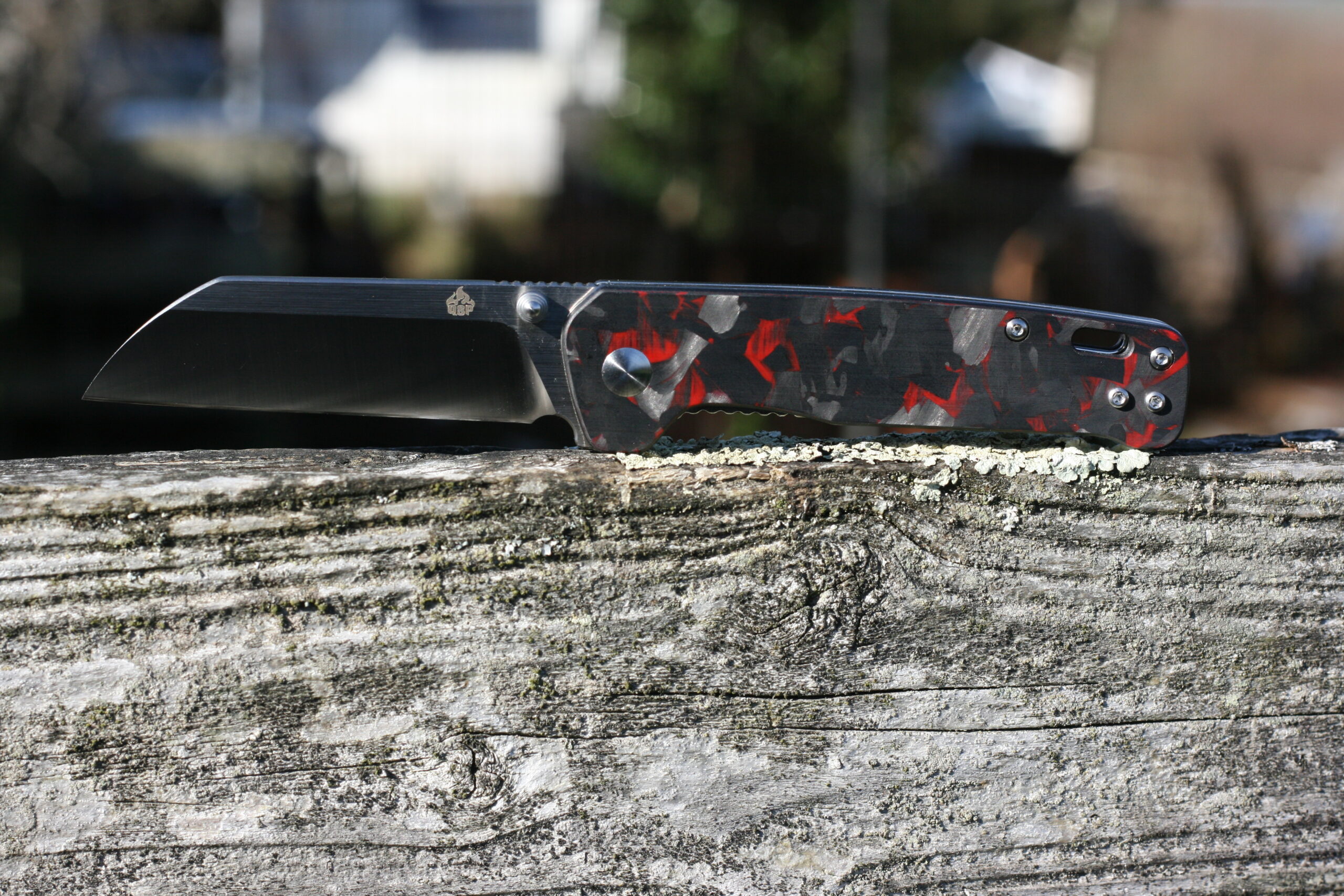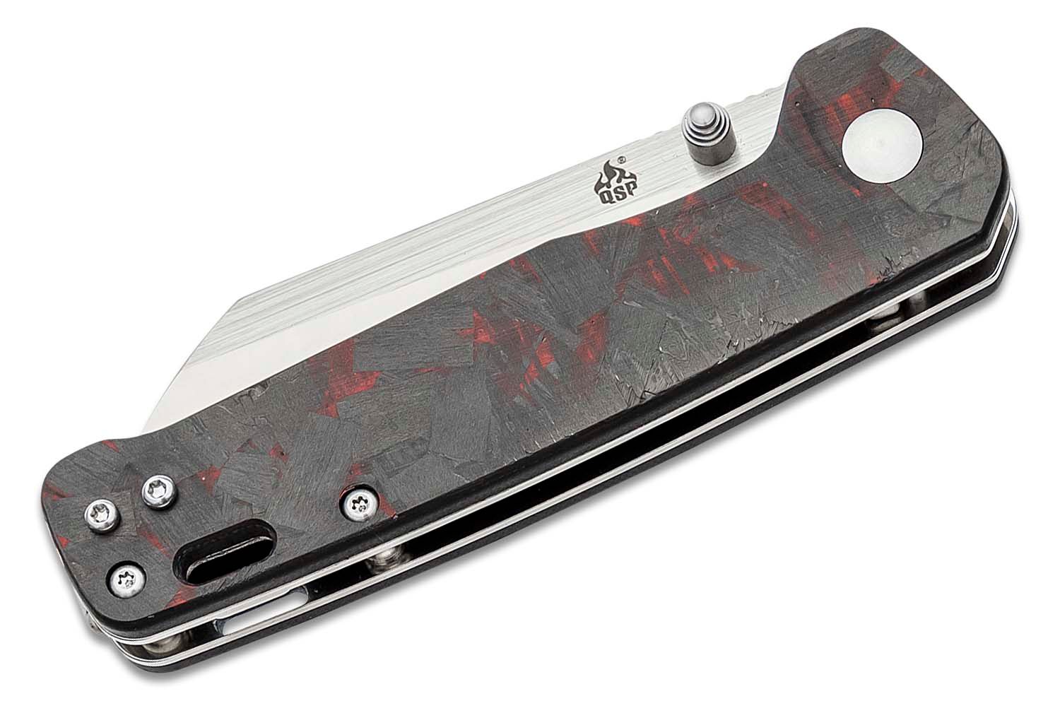 QSP Knives Penguin Folding Knife 3.06″ D2 Two-Tone Satin Sheepsfoot Blade, Red Shredded Carbon Fibre Handles – QS130-TRD
