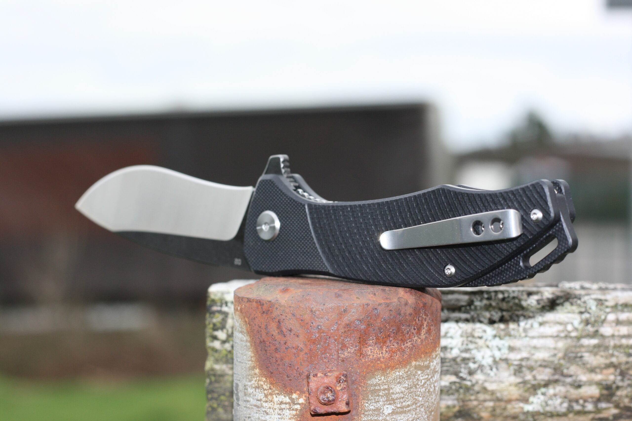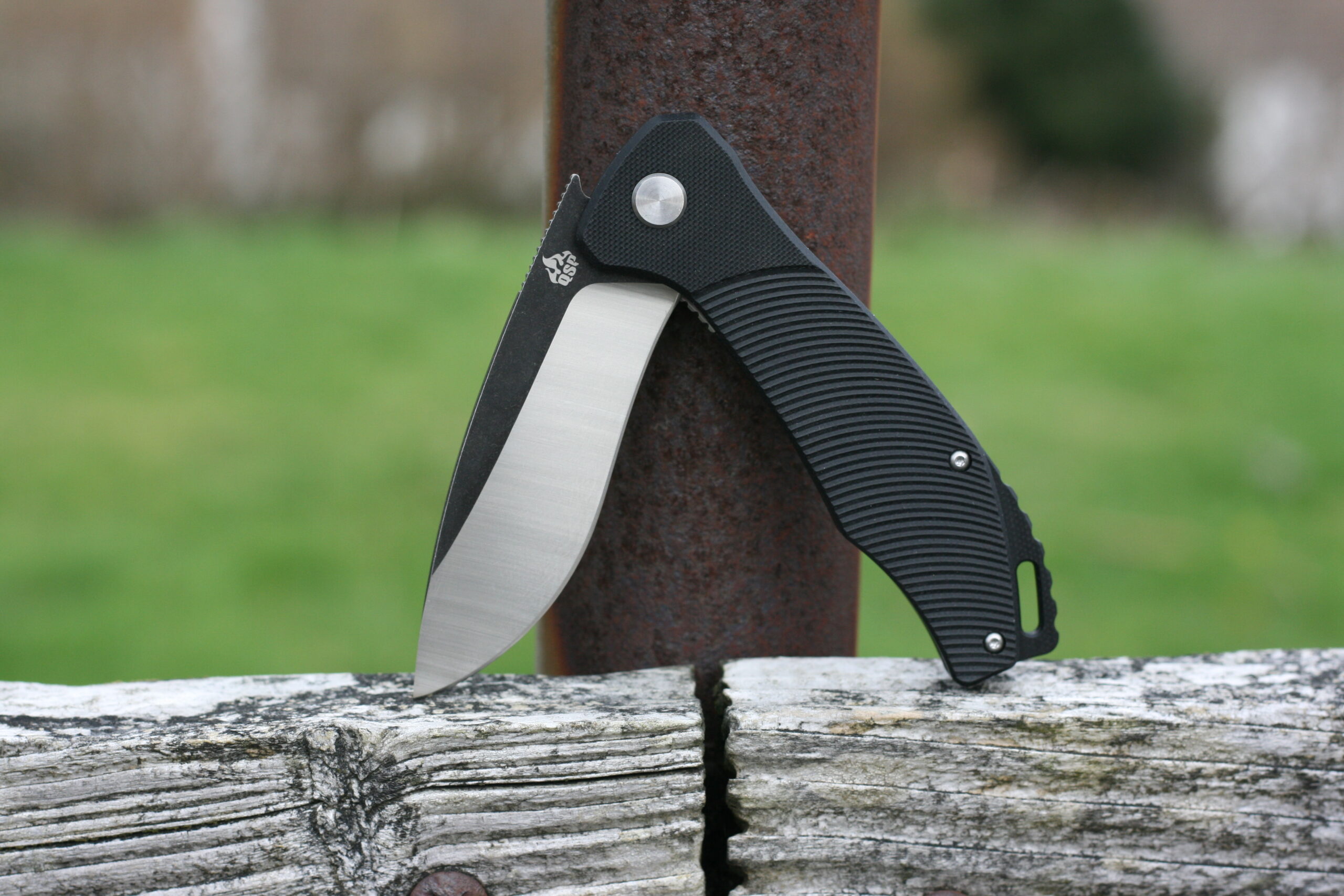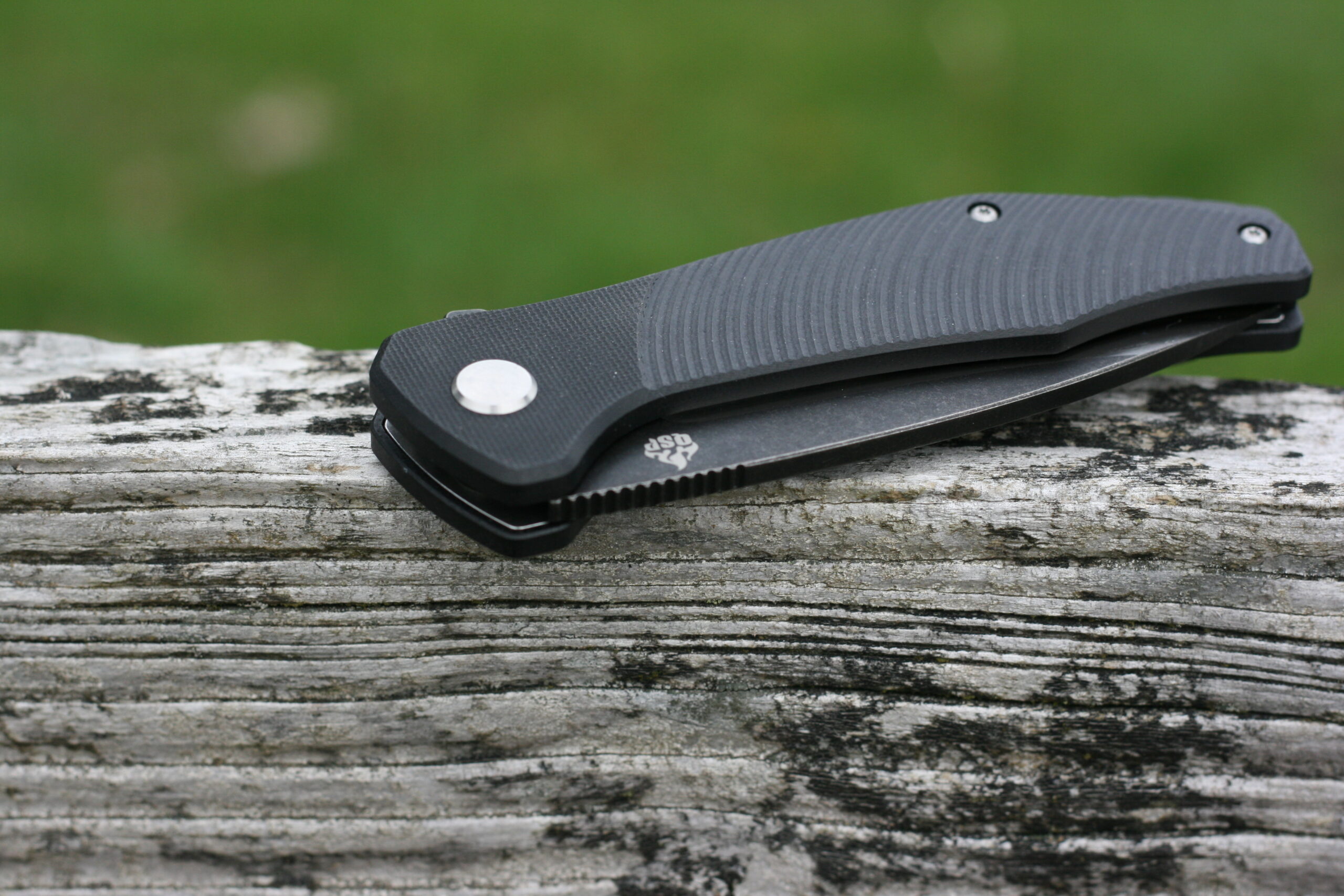 The QSP Raven is a great folding knife for outdoor adventures, or everyday use. The blade has a gentle recurve to it, and a deep belly that makes slicing and skinning tasks a breeze. The G-10 handle is directionally textured for a good grip, but not so rough it damages a pocket. The blade has a very broad and thin grind for maximum cutting performance.