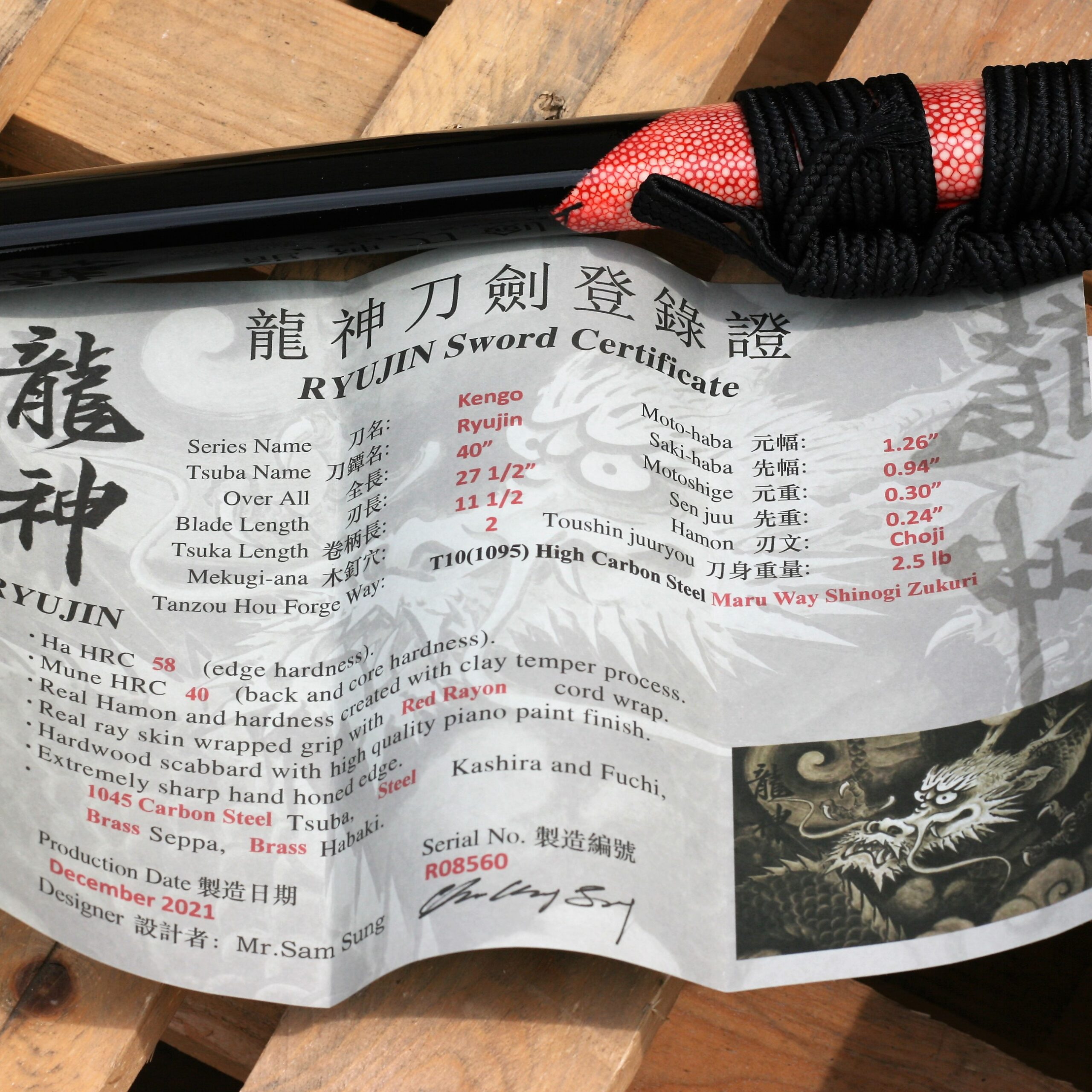 Ryujin Dragon Katana 27 1/2″ T10 Carbon Steel Maru real tamper/Shinogi Zukuri blade – Scabbard w/ Real Ray Skin Top Section –