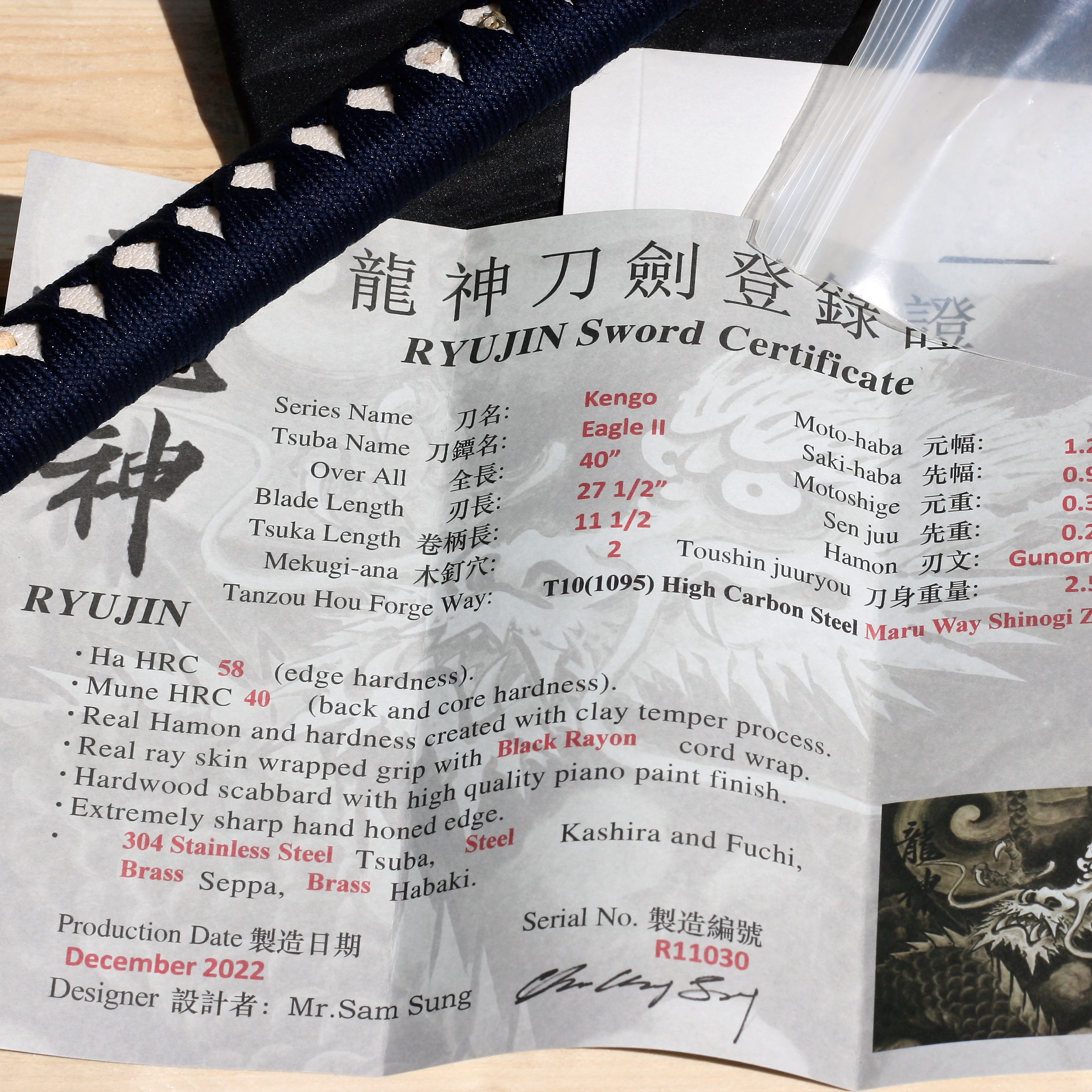 Ryujin Eagle Katana 27 1/2″ T10 Carbon Steel Maru real tamper/Shinogi Zukuri blade –