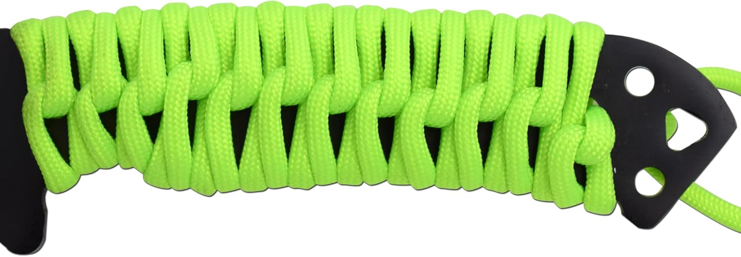 Measuring 12″ in total, this knife features a 7″ black-finished, stainless steel blade with a gut hook, machined slot cutout. It boasts a full tang design with an integrated guard, wrapped in neon green cord for the handle, complete with a lanyard. It comes with a black nylon belt sheath . This attractive knife performs excellently, and the neon handle really makes it stand out.