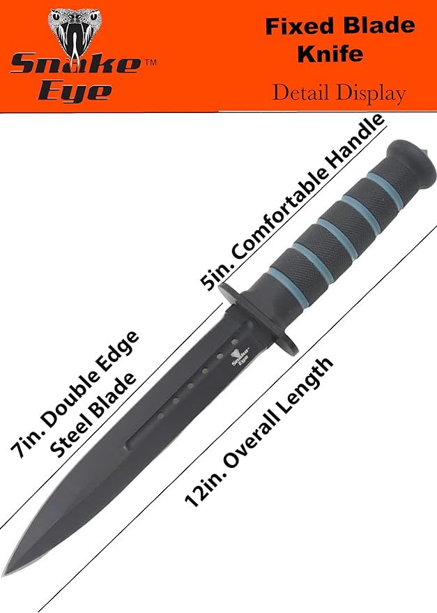 Snake Eye Tactical Fixed Blade Hunting Knife Collection. 12″ Overall length of Knife. 7″ Black Finish 440 Stainless Steel Double Edge Blade. 5″ Comfortable Rubber Handle With Glass Breaker. Comes With Nylon Sheath