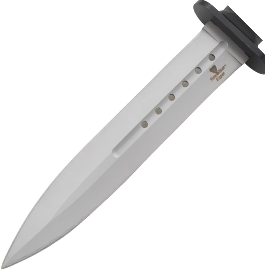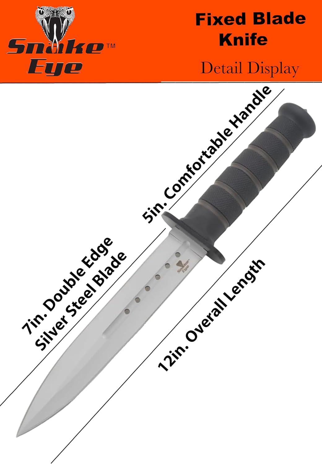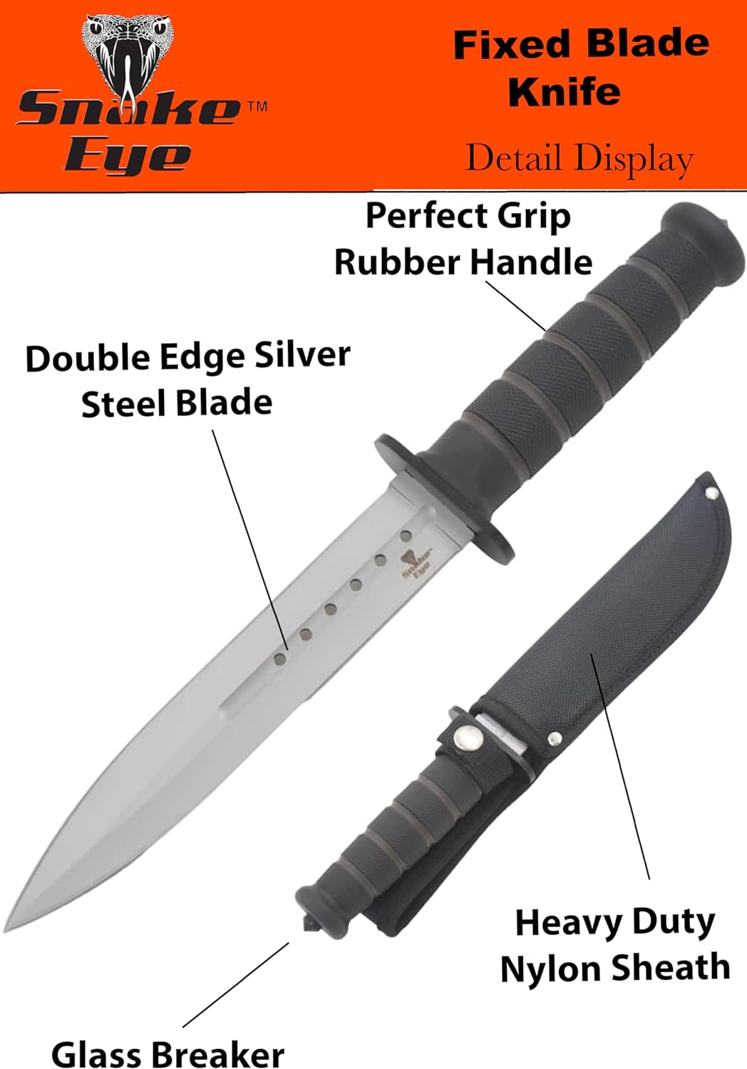 Snake Eye Tactical Fixed Blade Hunting Knife Collection. 12″ Overall length of Knife. 7″ Silver Finish 440 Stainless Steel Double Edge Blade. 5″ Comfortable Rubber Handle With Glass Breaker. Comes With Nylon Sheath