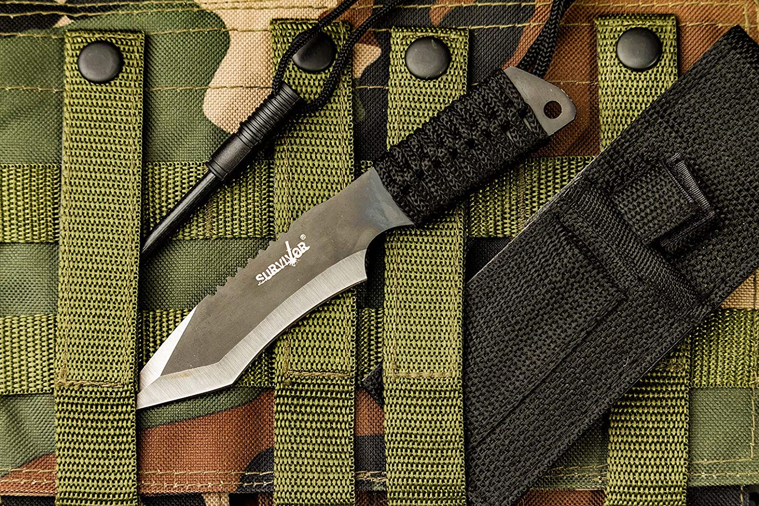Measuring 7″ overall, this full tang, fixed blade knife from Survivor features a two-tone stainless steel tanto blade. The black cord-wrapped handle not only offers superior grip in even the wettest of conditions but also can be useful in a wide array of survival situations. The handle also has a lanyard hole and extra lanyard. This knife also comes with a fire starter and a nylon sheath for easy transport ensuring that your knife is ready when you are. A great item for anyone who likes to spend time in the wilderness- be prepared, make sure you have your Survivor by your side.