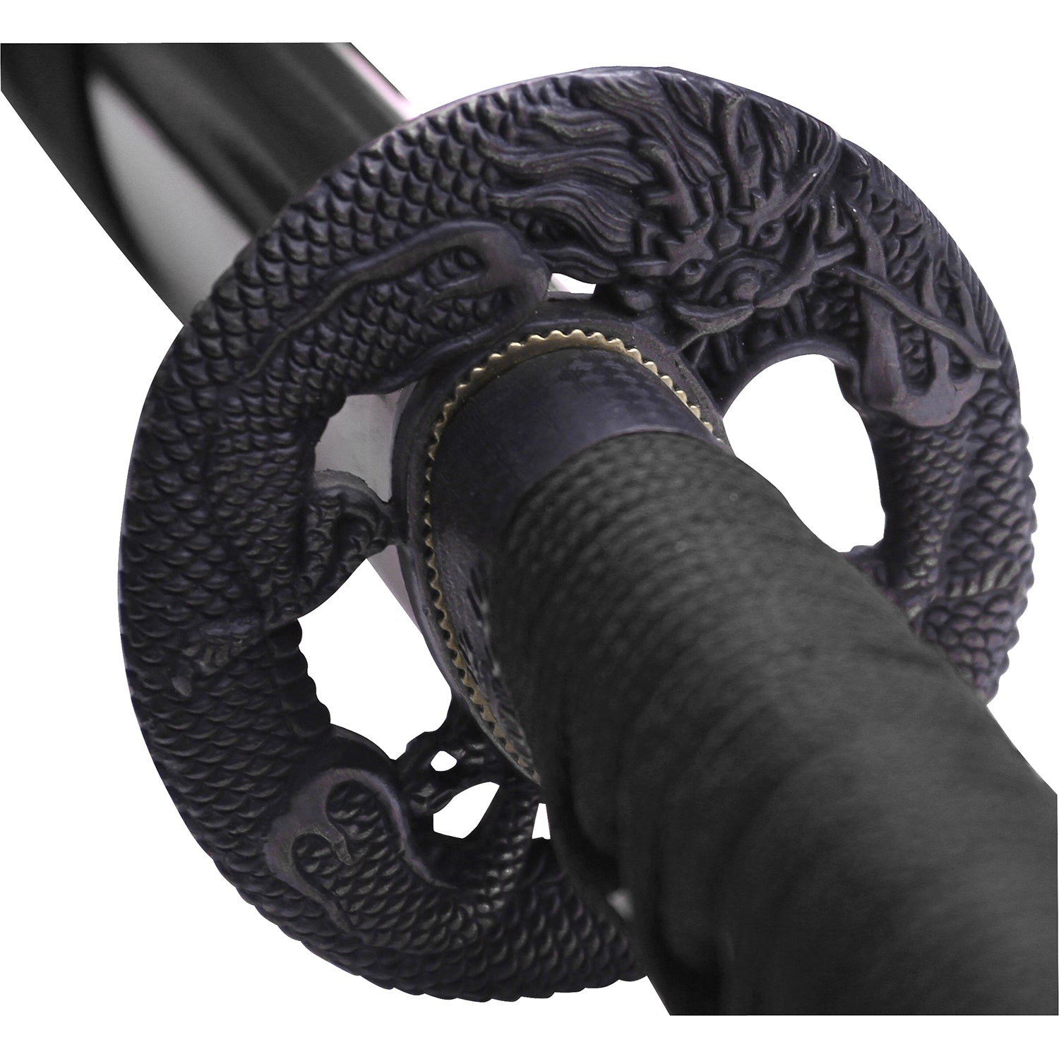 This hand-forged, three-piece Ten Ryu Samurai Sword set (TR-030 series) includes a 41-inch katana, 32-inch Wakisashi, and 23-inch Tanto, with scabbards for each sword and a black wood display stand. Made from 7mm-thick 1045 carbon steel, the katana has a 29-inch blade, the wakisashi has a 21-inch blade, and the tanto has a 13-inch blade. All swords feature artificial ray skin-wrapped handles with cord-wrapping for a firm grip. The swords also feature color-matching lacquer scabbards and an artistic tsuba hand guard with winding dragon. Ten Ryu offers a wide range of affordable Samurai swords, which are hand sharpened to ensure the sharpest blade. Swordsmiths combine modern knowledge and traditional secrets to produce superior quality swords with enhanced durability, sharpness, and exquisite craftsmanship.