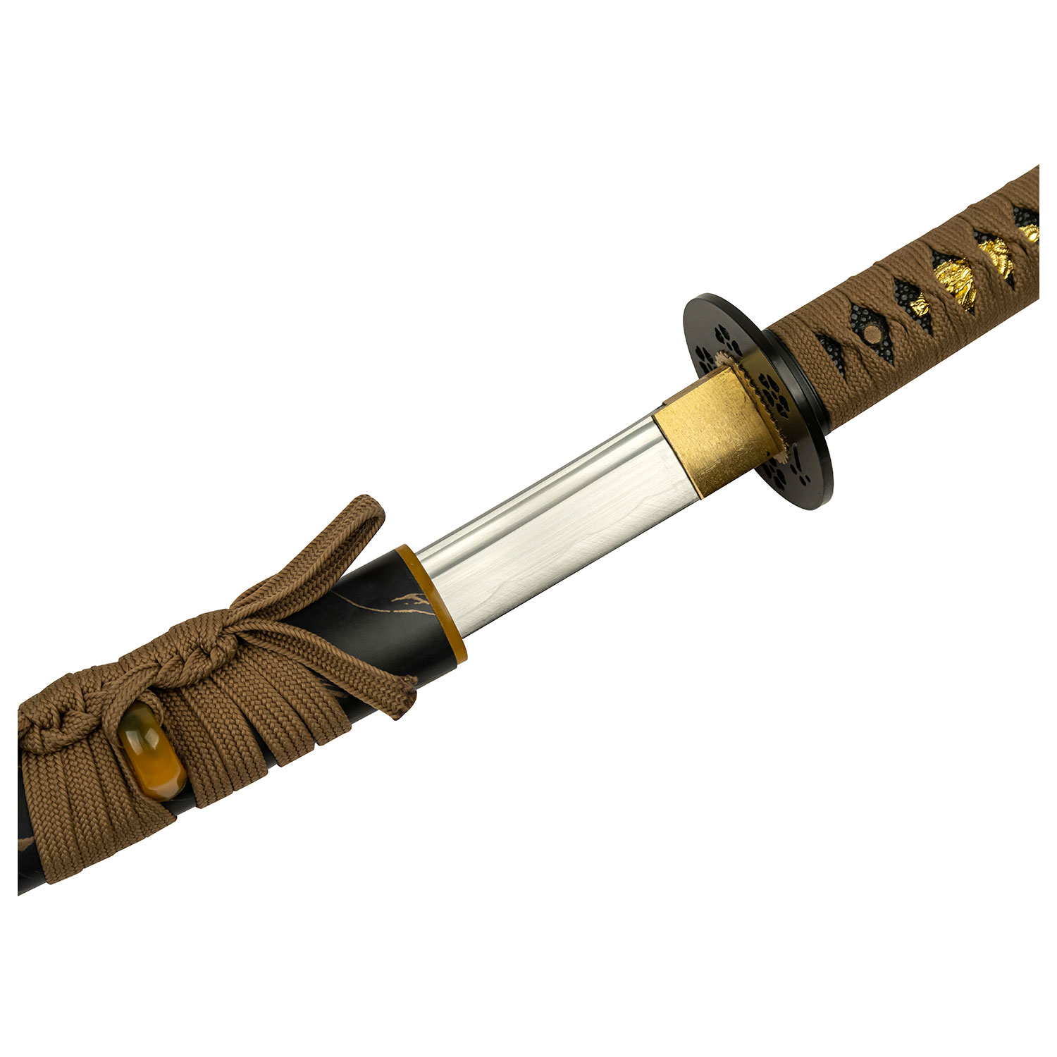 Lovely hand-forged 40.00-inch overall length samurai katana sword. The sword is hand sharpened high carbon steel blade with blood groove. Brown cord-wrapped handle, zinc alloy tsuba, and special patterned scabbard.
