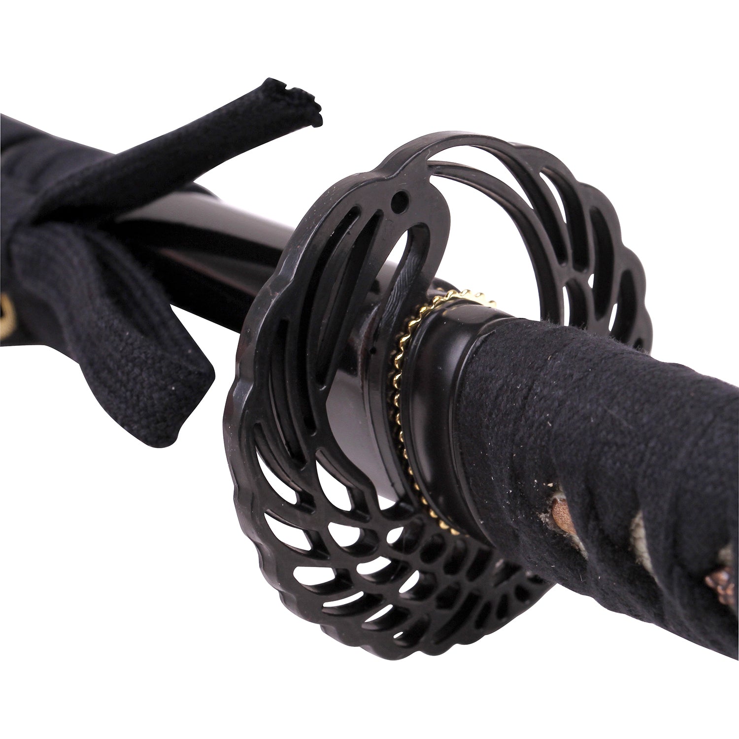 The blade enters into the handle at a black tsuba. It features an open, wing-like design. The handle has a cord-wrapped grip. Black cord wraps around the white handle. Finally, the sword comes with a matching black wooden scabbard. The Wing Katana is not only functional but also looks wonderful on display in your home.