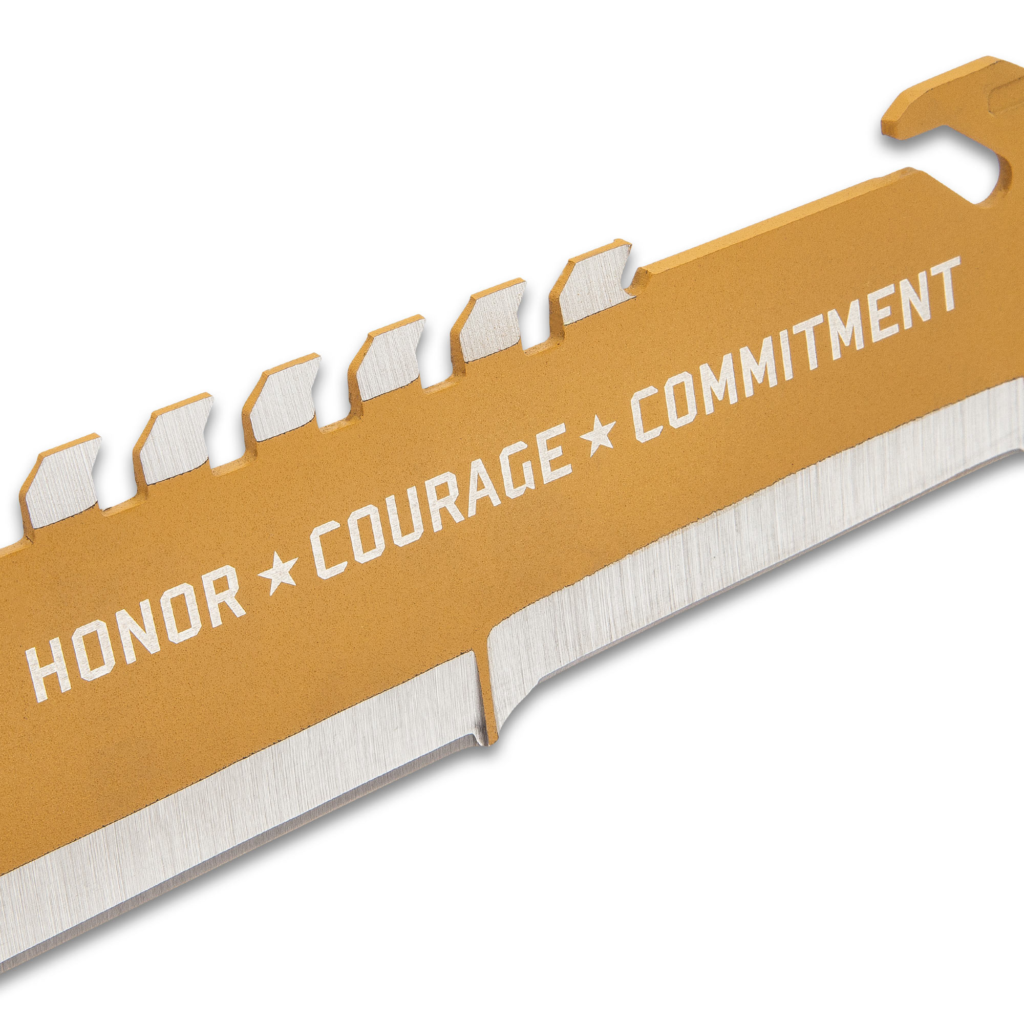The officially licensed USMC Desert OPS Sawback Machete embodies the fighting spirit of the Marines with its rock-solid build and a reminder of the core values every Marine stands for running the length of the blade. The machete has a 17 3/10” stainless steel blade with an olive drab, matte finish and heavy-duty saw serrations running the length of the spine. Printed, in black, on the blade, are the words “Honor, Courage, Commitment.” The grippy handle has ridged ABS handle scales secured to the full tang with heavy-duty screws and an extended point pommel. The 24” overall sawback machete can be secured and carried in a tough and durable 600D nylon belt sheath with an adjustable shoulder strap.