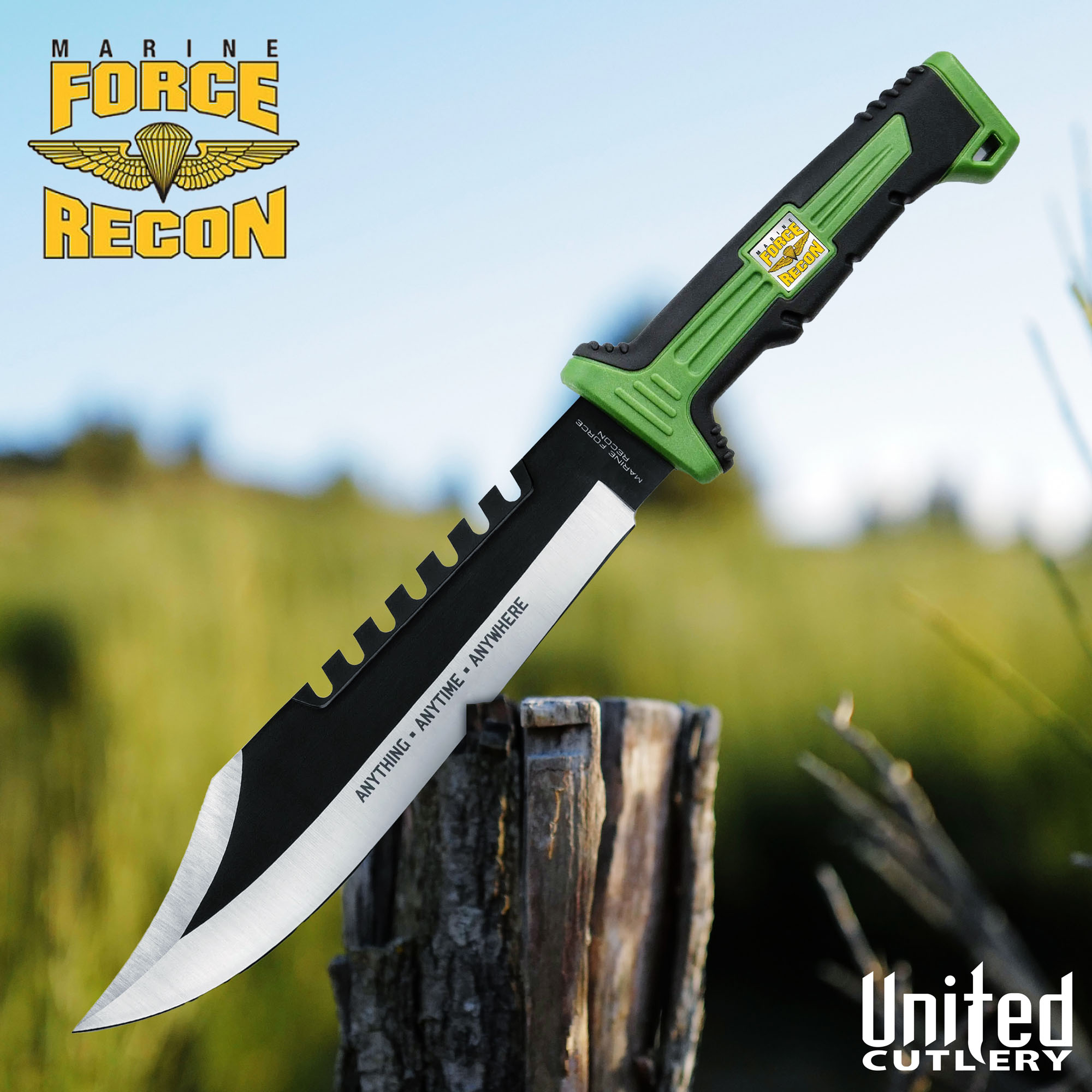 A medallion of the infamous Marine Force Recon logo is embedded in the handle and is accompanied by a slip-free grip