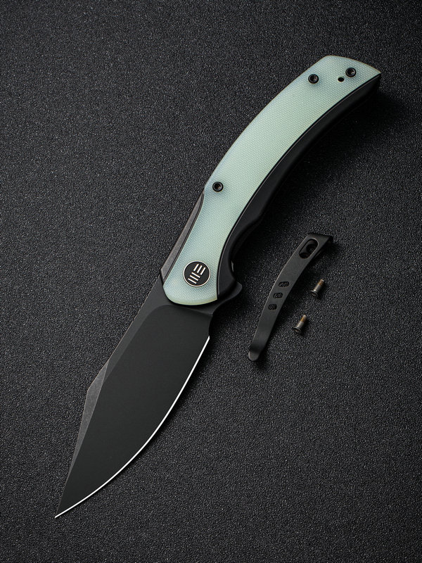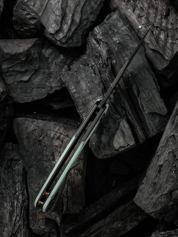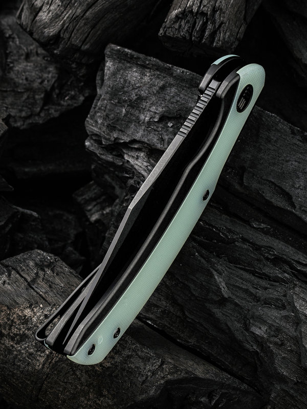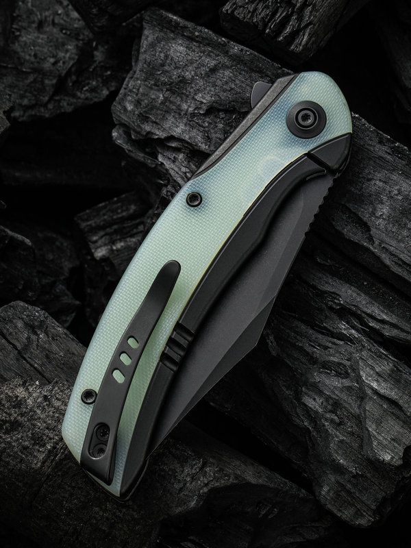 - Black titanium frame with natural jade G-10 handle scales.