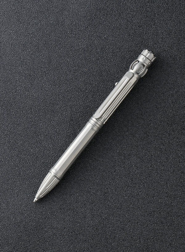 The titanium body has a tasteful machined design with a comfortable spot for your fingers while writing. A ball end doubles as a glass breaker and a machined titanium pocket clip and screw make sure this pen has plenty of style, even when clipped in your pocket.