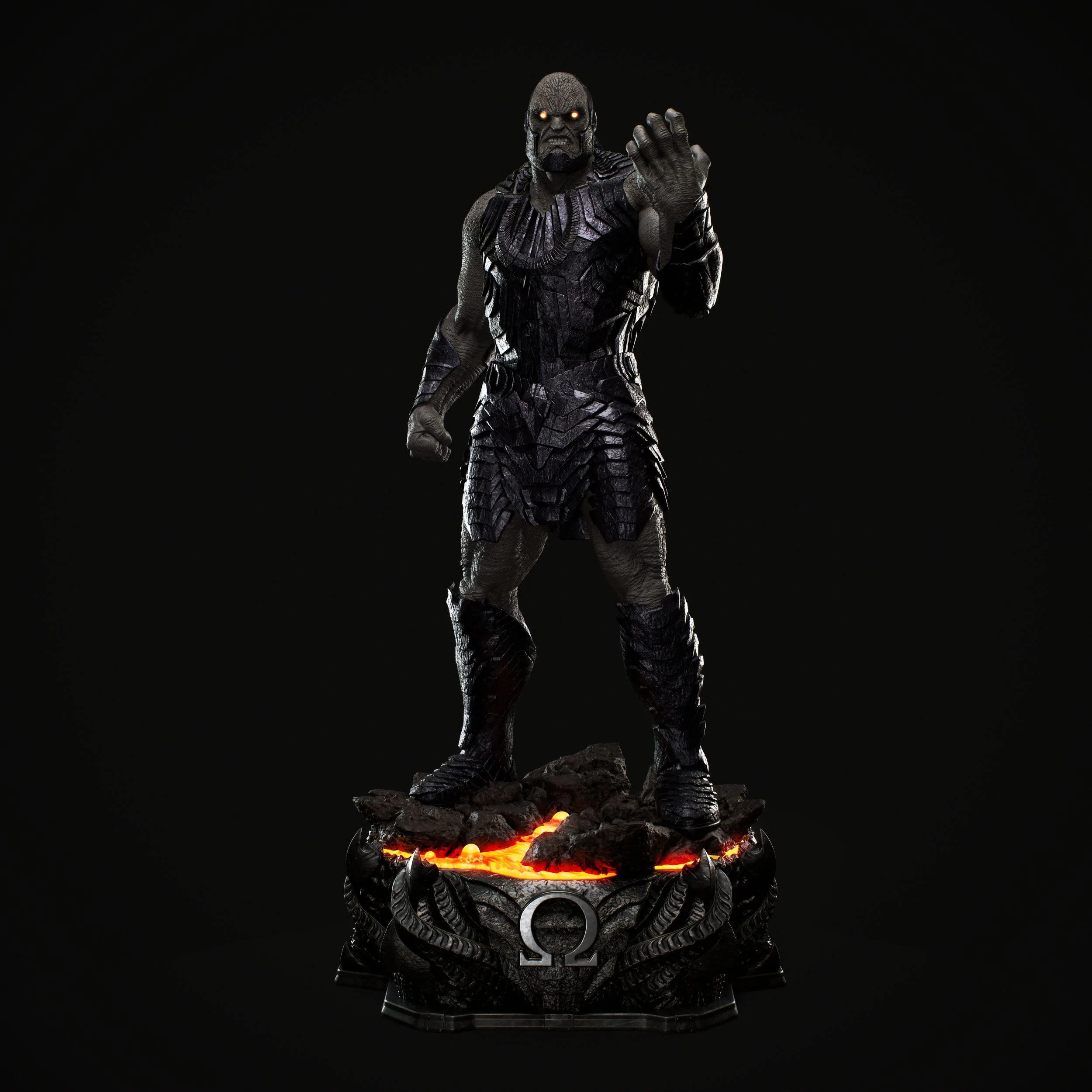 2021’s Justice League, Zack Snyder’s magnum opus for the illustrious DC pantheon, brings us a new version of the story, and with it the immortal Lord of Apokolips! Standing defiantly at over 41-inches on his scorched-earth base, Darkseid is about to show Earth the folly of their resistance. Prime 1 Studio has labored diligently to present the New God Uxas, as he’s also known, in his most terrifying best. Darkseid is one of the most powerful beings in the whole DC Multiverse, and this statue captures that ominous, superhuman energy through his posture, attitude, and stance. Frame after frame of the Snydercut film was studied to imbue this Darkseid statue with the proper invulnerable texturing of his skin, the layered intricacies of his clothing that features his Omega symbol, and the menacing proportions of his size. Painted to give depth and life, by applying layer upon layer of the most accurate basecoat, dry brushing, dark washing, and multiple finishes to complete his awe-inspiring presence. His Apokoliptan armor is painted in a dark metallic hue to reflect the darkness that envelops all who lay eyes upon him. As if he weren’t intimidating enough, Prime 1 Studio’s wizards gave Darkseid 2x LED-Illuminated eyes (activated by a hidden switch), to add even more peril to his frightening gaze. The God of Evil’s right hand holds his war staff, for use not only in commanding his armies, but also for cracking the very Earth beneath him. And to complete this masterwork, Prime 1 Studio has given the Dark God a base befitting his godly stature, recreating the ground that crumbled at his feet upon his arrival, with molten earth, and realistic rock texturing surrounding it. And adorning his pedestal, a fitting centerpiece – his Omega symbol – once more, signifying that Darkseid is, and will always be, “The End”.